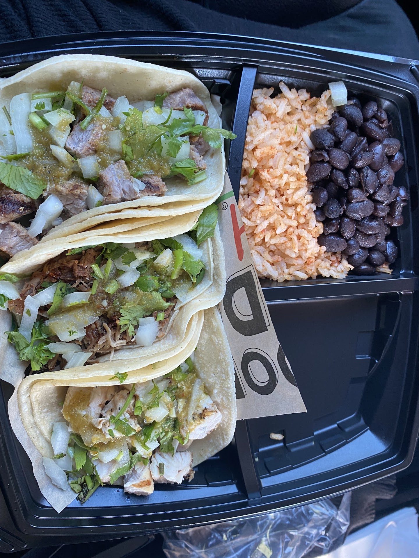 I order the Street Taco Trio which comes with 3 soft corn tortillas filled with grilled chicken, steak and carnitas with black beans and rice and two choices of sauces. I chose Salsa Baja and Salsa Verde (medium) salsas. And it only took about 15 mins before my food was ready!