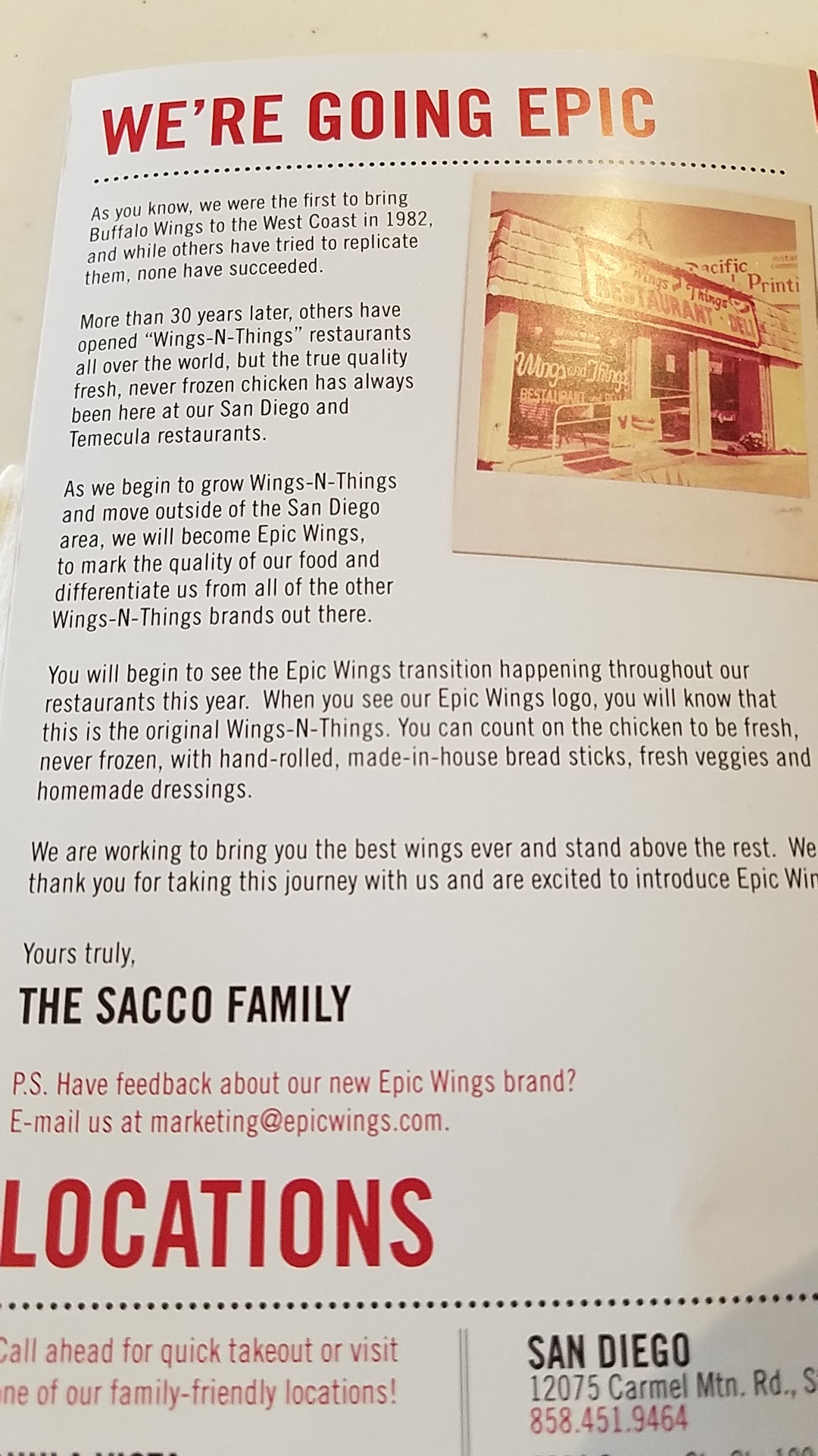 Read moreLiving in San Diego all my life this was my go to place for wings. ( They used to be named Wings n Things ). I recently moved to the Mission Viejo area and I had to settle for the Buffalo place for wings until today. My family and are very happy to finally have our favorite wings here in O.C. If you have not tried them you are missing out. The wings are a perfect combination of tender and crunchy. The different sauses are just delicious!!. The veggies are always crunchy and fresh. But the best thing about Epic Wings are the bread sticks. You will fall in love with these. They are so soft, buttery and tasty that you will want to order more. The place is very modern looking, very clean and friendly. So if you are craving wings give this place a try. I guarantee you will be coming...