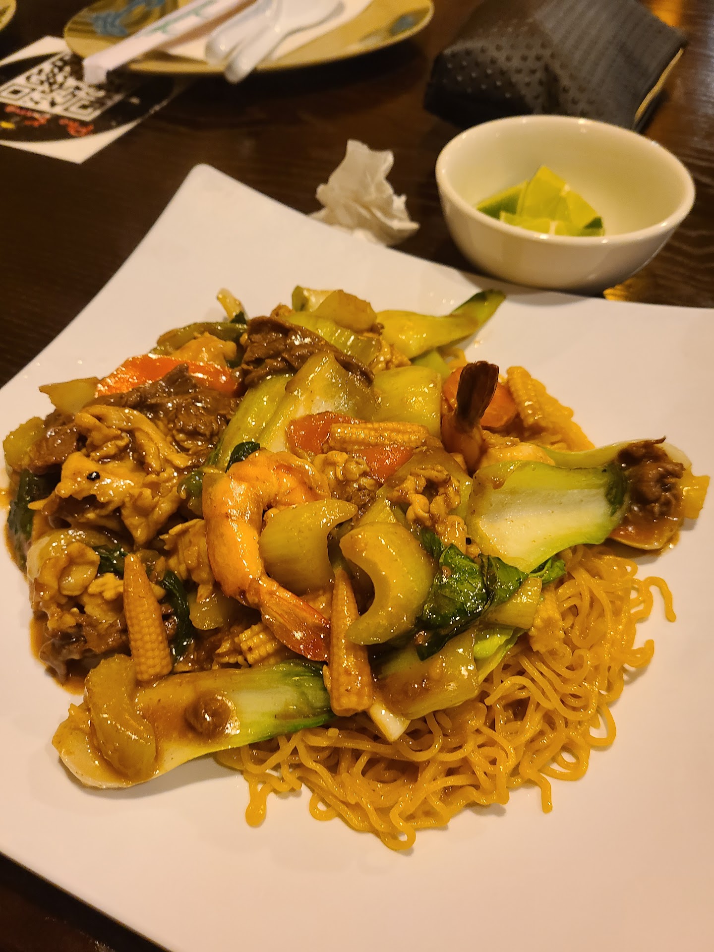 I ordered a chef's special with soft egg noodles and combo of beef, chicken and shrimp. Asked to exclude broccoli and onions and they made it exactly as ordered. Such a yummy dish, I finished almost an entire plate despite the generous portion. Boyfriend helped with it of course and we both loved it.