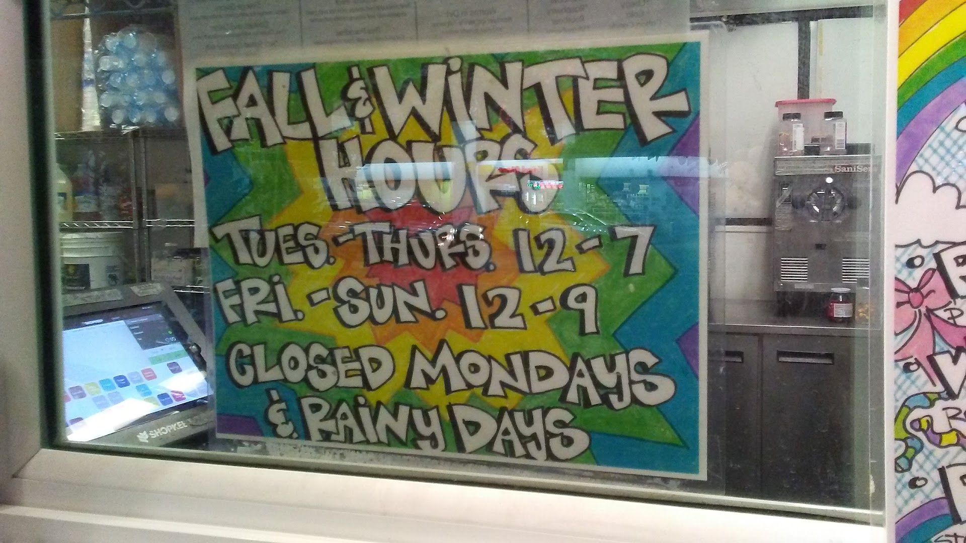 In the past we have loved this place and have always made a point to stop by when we are in town. There is strong reason why the last two visits have been disappointing. Last visit they were closed for no apparent reason. Yesterday they were open but after standing at the window for a several minutes we noticed a small sign written in crayon that said the window was closed, drive thru only. Several others were standing at the window as well. We walked back out to our car, drove to the end of the line with nine other cars in front of us, slowly made it to the front, only to find that they were out of ice cream and fruit, so we basically had a glorified snow cone with no discount. Service was slow, and we watched one of the two workers wash his hands and dry them by running his fingers through his hair ... no lie. Not sure if Sno 2 Go will stay on our list of things to do...