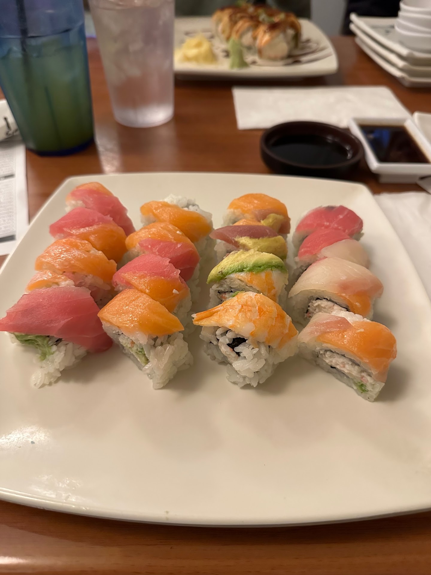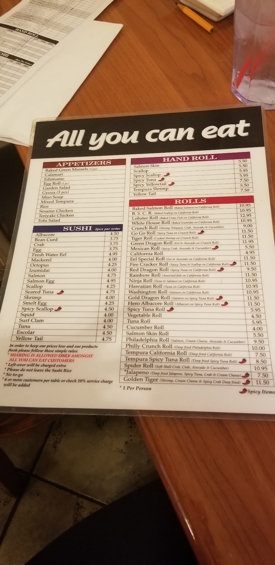 Read moreI don't remember if I went to a sushi place with all you can eat. I don't know why I accepted the idea and went for it. I went with some young people and followed their recommendations since they were here before. I love spicy tuna and that is it. Sure I try all the other ones, but I know a good spicy tuna. Food arrived and it was a mountain of sushi. We had a lot of people but it was too much. Flavor profiles and looks were similar. Maybe little stickers identifying what is what would help. For what it is, it's great. Not my cup of tea. Service was fine. One two servers running around and working overtime. Hard to waive them down for fresh water or else. Be ready for your order...Three sushi Chefs behind the bar creating what is ordered.(I think, they must have prepared rolls). It's a full restaurant and three TVs preparing the background noise and color. We made a beginner mistake and ordered too much not knowing how much it actually is. Order less on the first of three rounds and be selective. Too much rice and heavy sources for me, covering the little flavor sushi has. Not what you normally expect from a sushi restaurant, but I had to remind me - all you can eat! Don't expect first class sushi, you will get 'sushi' not first class. The tuna was not in one piece, rather a tartar. (Hint).Check it out and find your favorite. It was OK for hungry hippos who want to believe they get a great deal for $30... I suggest, eat less and get better...