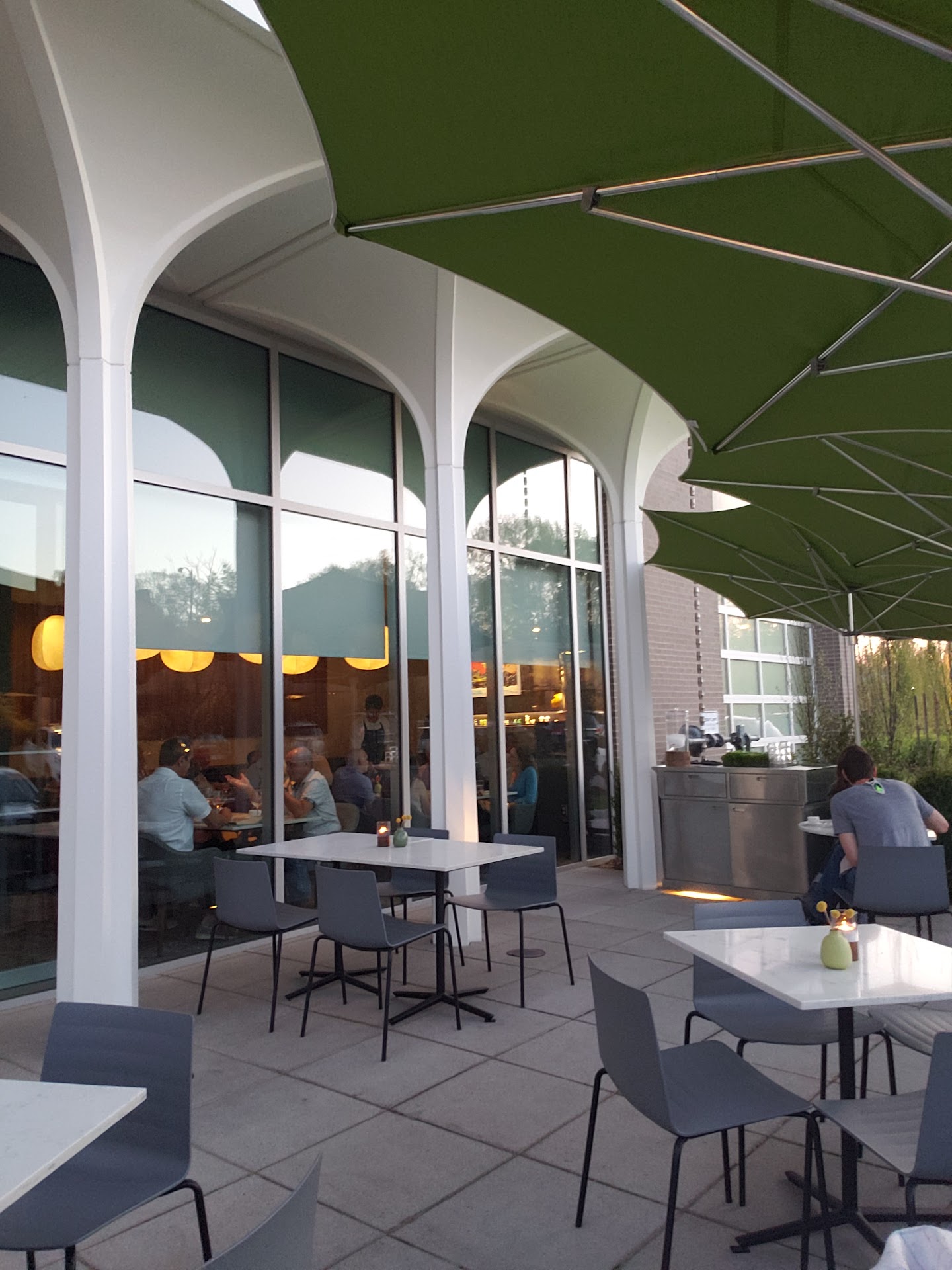 There's plenty of parking available in an aesthetically pleasing three-story parking facility that has electrical car-charging offerred in some of the parking spaces, most of which were open for those in need of a battery charge during my visit between 5 and 6 p.m. on a Wednesday. As I mentioned, the parking facility is quite aesthetically pleasing because it's constructed in such a way as to be partially underground with one side open to the air while the back side is underground with a entry drive at the top floor of the parking structure, relative to the restaurant, and another entryway drive at the bottom on the front of the structure, again relative to the restaurant, and yet another entryway drive at the side to ener the mid-level parking. My apologies for my great lack of...