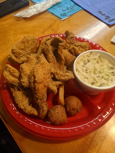 First time visiting. Offers catfish fillets, fried oysters, boiled or popcorn or fried shrimp, BBQ ribs. Can get half and half combo plates. comes with fries, baked beans, coleslaw slaw or potato salad. Good sweet tea, generous portions. Catfish is hot and delicious and large fillets. Potato salad is fine. More than I can eat in one sitting. Service is friendly and fast considering how busy they were. People were very nice and helpful. Wish I had known this place was...