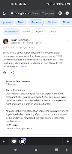 Read moreI have ordered twice from this location and both times they have sent my food to the wrong address. The app said my food was delivered but there was nothing at my front door. I called the store and told him my food said it was delivered. He told me it was on the way after I had told him I got an email saying it was delivered. At this point it has already been 40 minutes. But he insisted it was on the way. So I waited another 10 minutes and still nothing. This dominos is only 2 miles away, mind you. Then my neighbor texted me saying it’s been sitting outside his house for over 10 minutes. This is the second time this has happened. My order was over $71+ including the $10 tip (which they did not deserve), all that food sitting in the cold weather and the guys at the store were not apologetic. Did not offer any reimbursement. After 15 minutes on the phone he finally offered to remake my food but I wasn’t willing to wait another HOUR. And possibly have them spit on my food.