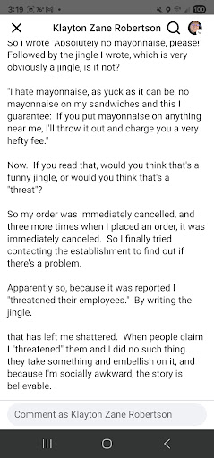 Read moreThe food is great, but evidently they gravely misunderstood my jingle about my opinion of mayonnaise. I really am sorry the words to my jingle offended you, but my actual words were that I would throw it away if it had mayo on it, not that I would throw it in the employee's face. It was just a cute jingle and not meant to be disrespectful. Refusing any further orders from me is extreme; I was only trying to make it unique so that they would remember, since previously I did receive a burger with mayo, despite requesting no mayo, and I had to throw it away because the smell of mayo makes me sick. I didn't mean to be offensive, and being told that I was has left me shattered. I'm just going to leave you with the Facebook post I made right after the exchange just so that you'll know I'm sincere. You won't hear...