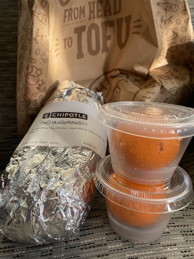 Fast forward to this afternoon. I had decided I wanted to eat Chipotle, and had entered my order into the website. When asked to give my meal a name, I requested input from my roommate. She explosively exclaimed "TWO TANGERINES!!!!" once again. It was too good to ignore, so I gave my meal the name "TwO tAnGeRiNeS!!!!"