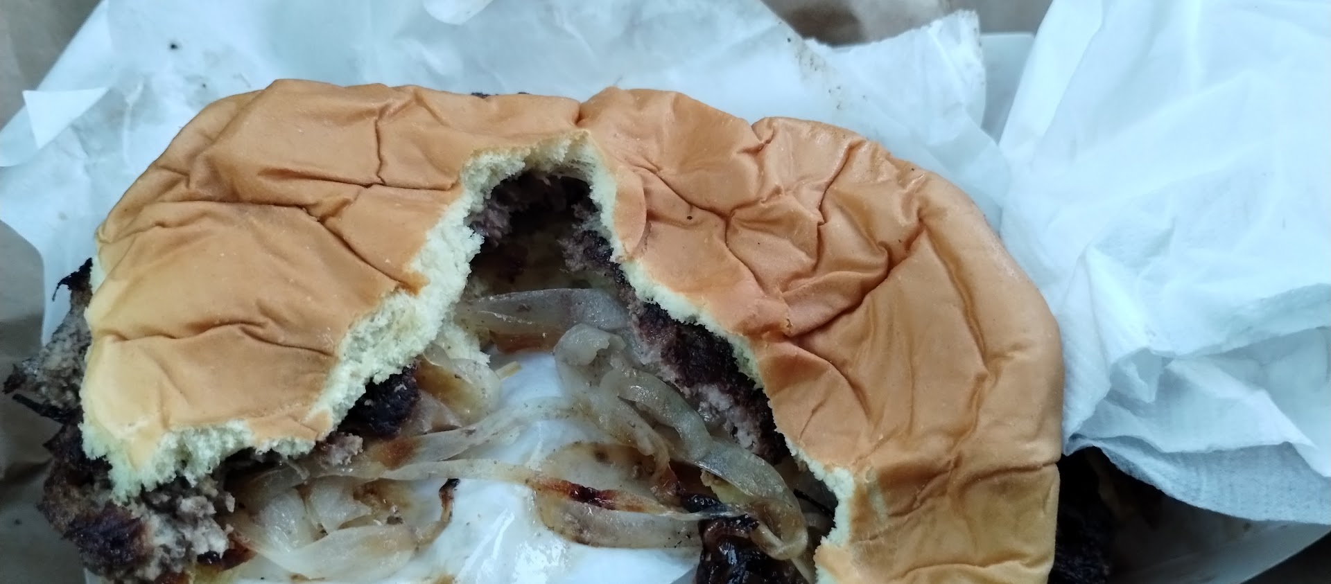 Last night I had the opportunity to eat my 4th Burger in two days from this company. I found the original one in downtown and had burgers there and then I had a burger here tonight. I wanted to see if there was a difference and I have to tell you that there's not much of a difference. The other burgers that I have eaten I did not get a photo but this burger I definitely did after I tore it open. As you can see the burger looks cooked perfectly and the onions had a good mix of chard and caramelized which, for my tastes, is perfect. I really enjoyed this burger. I will definitely come back when I'm...