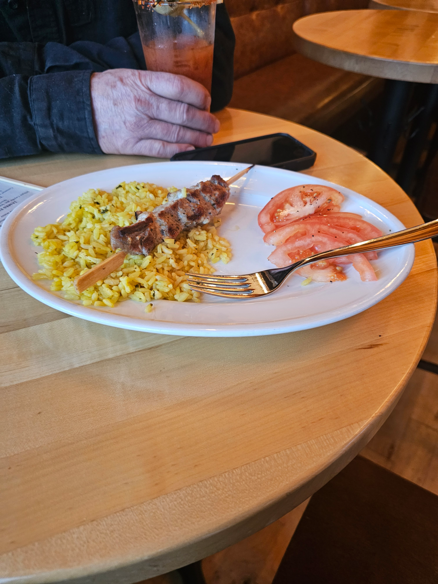 Look at this plate and tell me you wouldn't send it back? I tried, only to get my drink comped and was old I don't understand how food cost works and how they have "CoGs" to meet. She was using the terminology wrong when trying to cover up an aggregious dining decision that wasnt even hers. Yes the cook should have temped my pork. But what I see is a cascade of bad decisions. No way in hell does a pile of wet rice-a-roni a skewer of cheap meat and a slice of a tomato cost +$20.