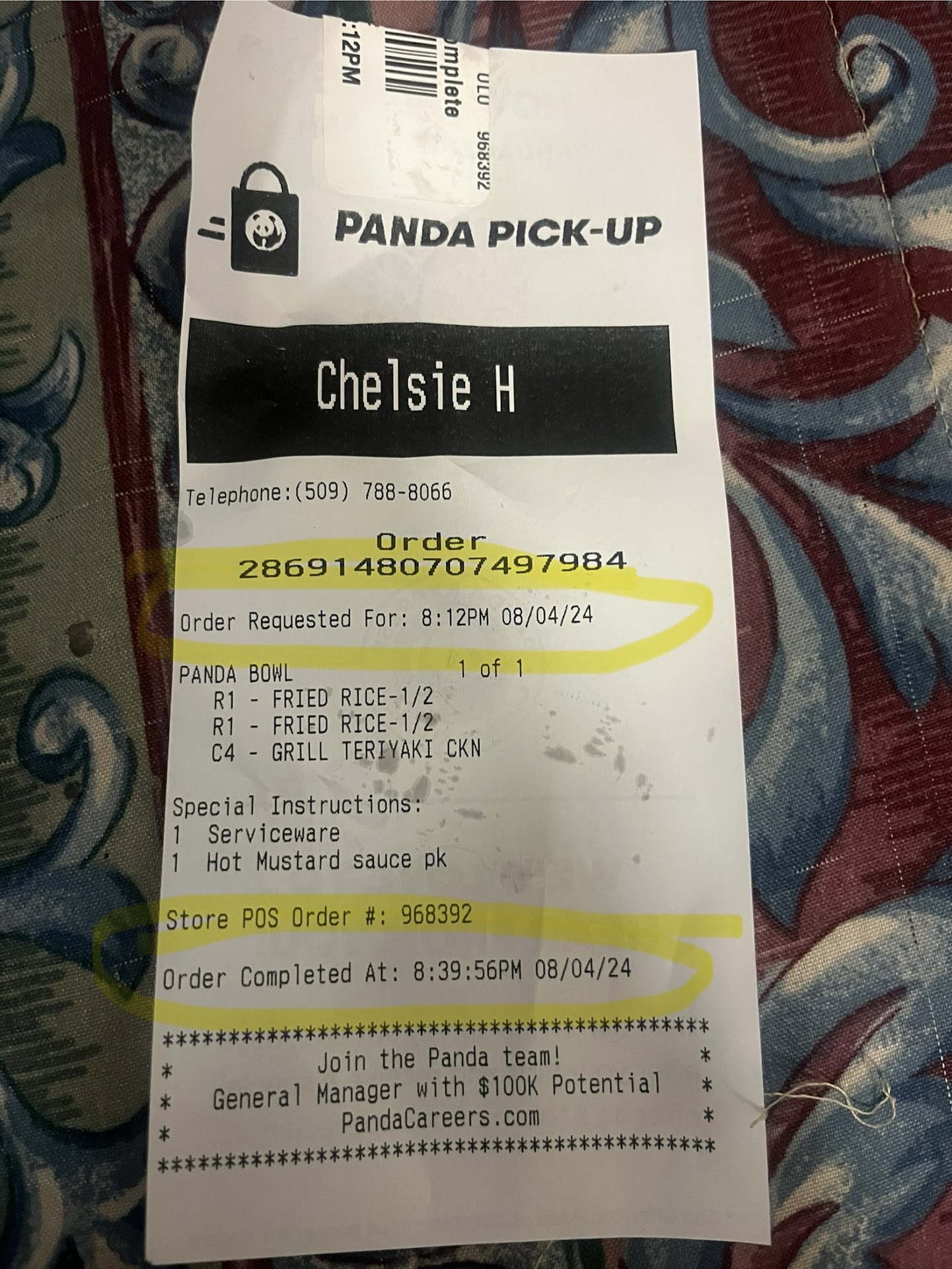 Read moreWe have done online orders through Panda's app before with few problems, so tonight we decided to do a family order for dinner. We placed our order at 6:47 p.m., and I went to the restaurant to pick it up. At 7:11, I got a notification that the order was completed, but when I went to the counter, they didn't even have it. I stood there for a while before I asked about it again and was told they were waiting on power greens. After more waiting, I asked two more times and was told again that they were waiting on items. At the same time, I was watching them serve the items I was waiting on to customers who had just walked into the lobby. We finally got our order almost an hour later at 7:37. Unfortunately, we had an hour drive home, and when we finally got there, we realized the portions they gave us were nowhere near family size. We've ordered family dinners before, and there were always leftovers for our family of four. This time, we barely had enough for two people. While I was waiting, there were also a lot of Doordash and Grubhub drivers waiting a long time for their pickups. And I don't understand why, but they had both exterior doors open on a 43-degree day, so it was FREEZING in the restaurant.