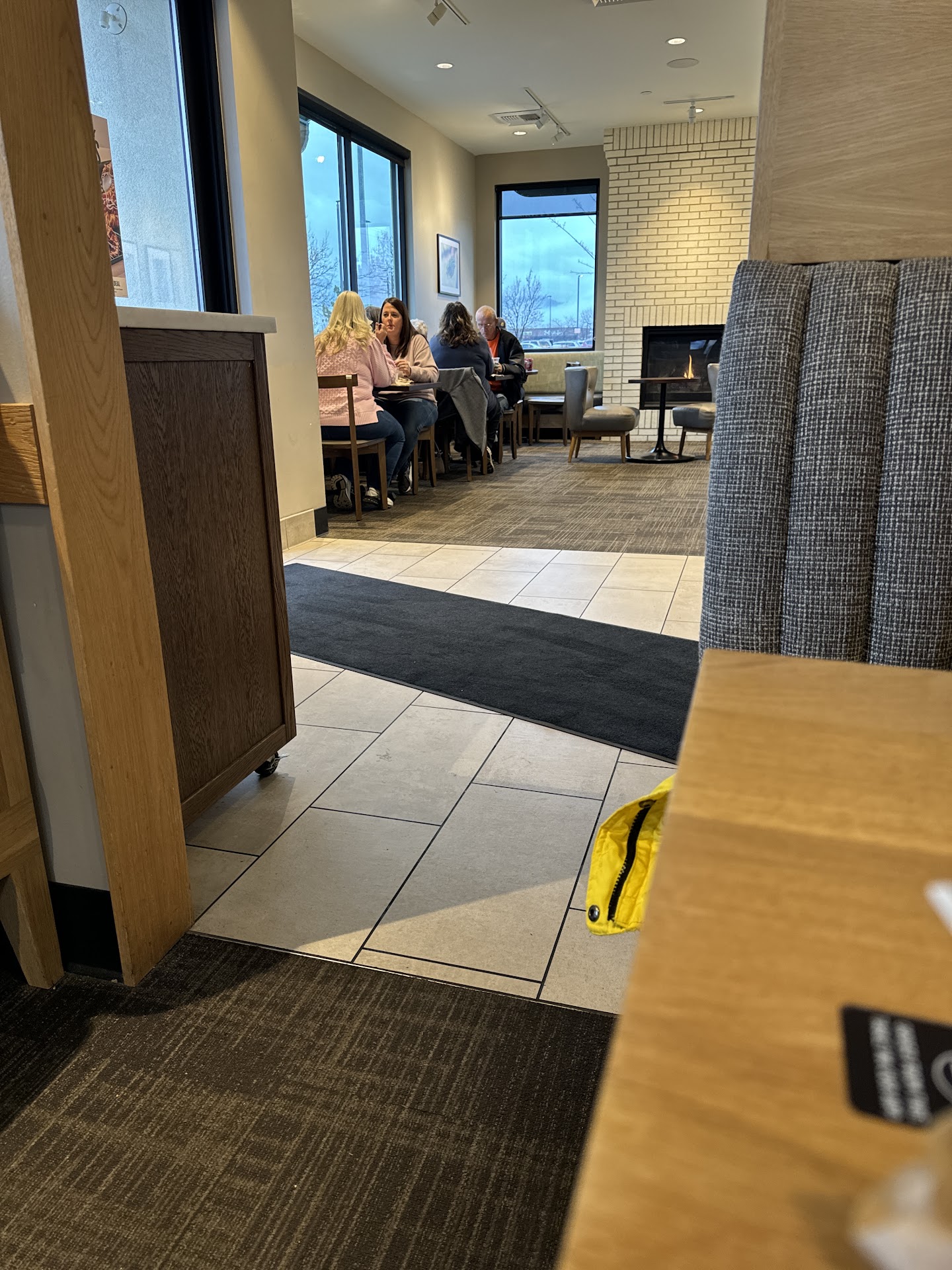 I took the order number tent and went to the pick up window. The nice manager put an individual pastry box on a plate. The icing on the pastry looked dry and crusty (looked cold). I politely asked if he could heat the cinnamon roll and he told me that there was a microwave in the cabinet under the coffee pots. I did not intend for it to sound snarky, but I did say that it would feel more like a restaurant if they heated the cinnamon roll in the kitchen. Had I selected 'to go' when I ordered, receiving the cinnamon roll unheated, in a to go box would have been perfectly acceptable. But I selected "dine in' informing them that I was going to eat the pastry in their dining room.