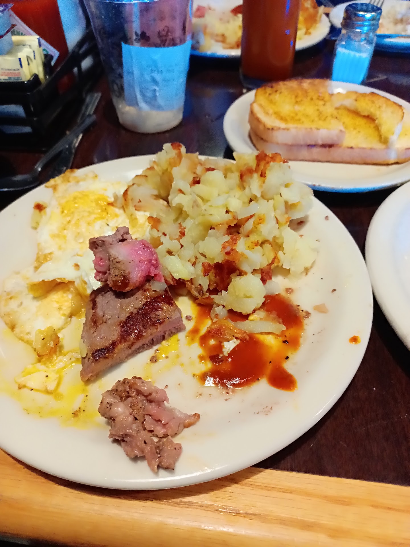 It is absolutely embarrassing that the kitchen would send that food out. After attempting to send it back the server claimed that I ate half of it. 2 bites were taken if you count the one I had to remove from my mouth, then flipped the steak over to take a closer look. Maybe she didn’t recognize it? I don’t know but that was horribly unprofessional and inaccurate. Then the manager took a hands off approach peering from around the corner of the kitchen while he thought we weren’t looking. Stopping to wipe his nose on his long sleeve red plaid shirt, and continuing to do some kind of prep work which I hope didn’t directly involve food. After watching him do that, I’m actually glad he didn’t come speak to me nor look at me in the eye while I tried to get his attention. Absolutely embarrassing. Working in the food and beverage industry for world class restaurants has taught me to own up to my mistakes, not duck around the corner and take little peeks while guests are not looking. I’ve never left a review of a restaurant, or even complained about food to a server, but today’s Paul’s experience has prompted my first. To make matters worse, my pancake was cold and hard but still edible. The club sandwich my aunt got did look and apparently taste great! A little interesting that the tomato was literally a half inch thick, but whatever, I like tomatoes and she does to. lol… My grandma received a salad that was a pool of ranch with a few lettuce wedges. I just don’t know what to say other than customer service no longer exists at Paul’s. I can deal with condescending servers but when you bring bad food into it, it’s over. If the meat is messed up, 86 the item. Fire that manager, there are people out there who...