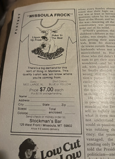 I was going to Stock's since well, let's just say before I should have been and I still try to make it back for a drink when I visit Missoula. Not sure if you have seen the shirts or hats but they say Stockman's - liquor in the front, poker in the rear. The place has been around for many many years and has become the local watering hole for many college kids. I enjoy going down there getting my drink on, having a "special" which is a black velvet (bad Canadian whiskey) and coke. There is also the "duck special" which is vodka and blue sports drink. Either way you are gonna have a headache in the morning.