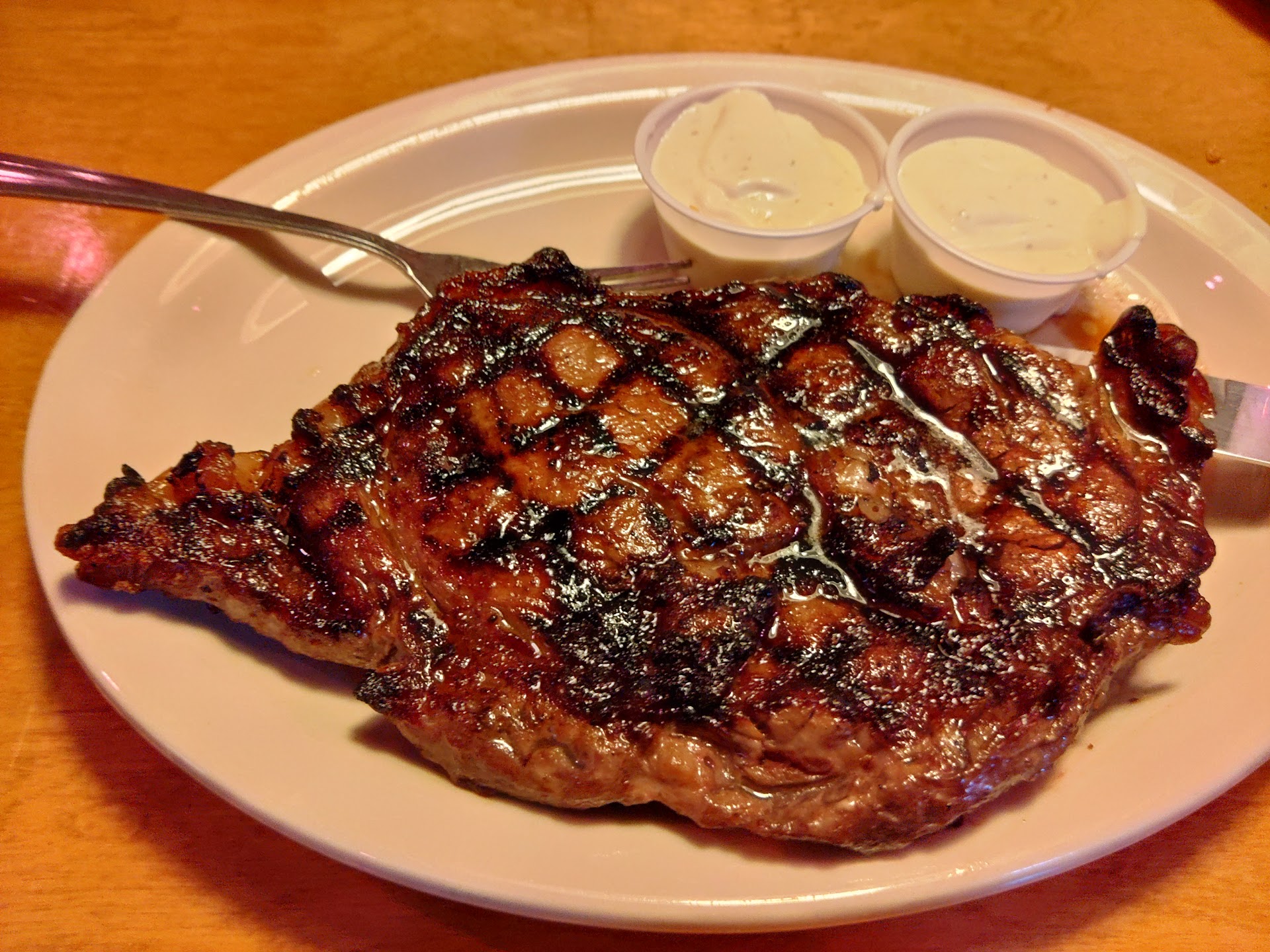 The last bad thing was the food. We did an appetizer and two salads to start. All of that as well as the bread were all great. My wife got a prime rib medium and it was a good looking cut prepared correctly. I got a 20 oz. bone in ribeye that was supposed to be medium with shrimp added on. The steak was raw. Cold and deep red throughout all but the very outer layer. I will eat damn near anything from rare to well done I order medium because I figure its the easiest mark to shoot for and have it still turn out good enough for me. It was flat out raw. The shrimp came out rubbery and cold with some sort of garlic butter lump on it. The shrimp also came with some toasted yet somehow also cold bread with the same garlic butter lump on it. I am unsure what happened with my meal but it was really bad when it came out. I ate the shrimp and loaded tater while the waitress had the kitchen put the steak back on some heat. When the steak came out the second time it was great. Good flavor and slightly more than medium on the temp but edible and good overall.