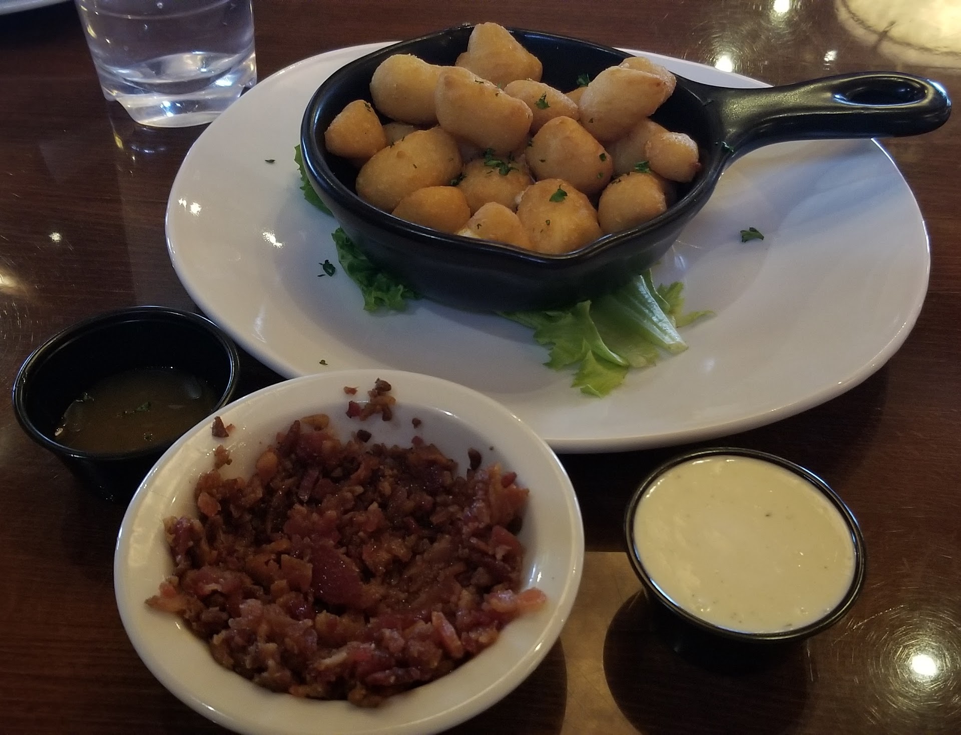 The lighting overall was quite dark and reading menus was difficult, even for daytime. We knew we wanted the TG meal special and didn't waste too much time ordering other than an appetizer of cheese curds with bacon caramel sauce. When it arrived, it had no sauce as our server must not have heard us correctly or the kitchen got it wrong. Regardless, in lieu of taking it back and getting it made proper, she suggested bringing sides of bacon and sauce. This was acceptable but we didn't expect the one cup with a few teaspoons in it. I'm not a fan of shared double-dipping either. By the time she delivered it, the curds had cooled considerably. (See pic) Also, the well worn cloudy water glasses could use replacing. Mine had a chip in it as well. The dishware was more indicative of an all-you-can-eat buffet quality than a supper club.(See pic)