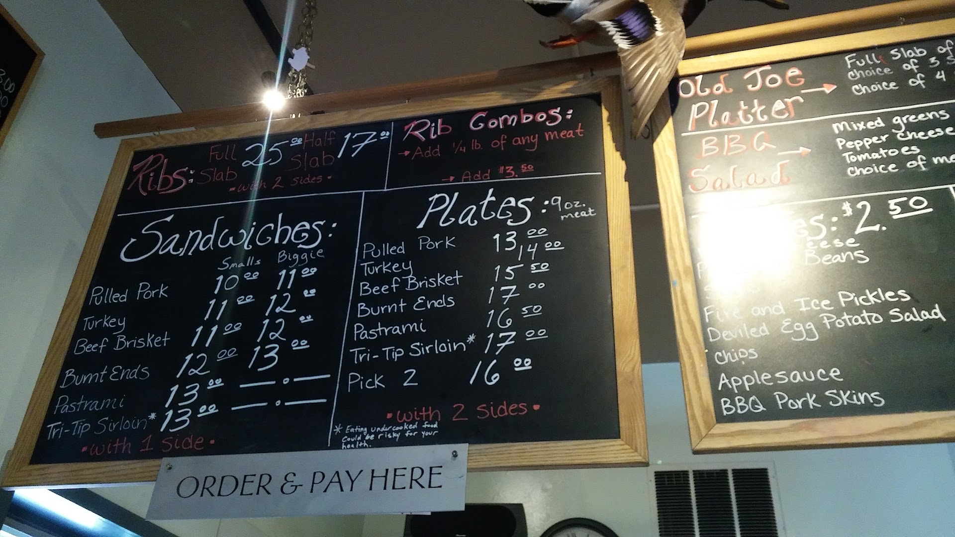 Read morePossibly one of the worst meals I've ever eaten. Don't waste your money eating here! You don't have to be an expert in BBQ to know what COLD, OLD and POORLY COOKED tastes like. We ordered the Old Joe Platter, for $52.00 + 1 beer + 15% prepaid tip = $64.40. This platter comes with a full slab of ribs (small, very little meat, too sweet and overcooked) 3 sandwiches (beef brisket) and 4 sides (two beans and two slaw). Sandwiches were served on an un-warmed CIABATTA ROLL with FOUR THIN slices of brisket per sandwich. First of all...who serves BBQ with Ciabatta?? And if so...one could at least have the decency to warm it up so it's not so tough and dry. To top this off...the brisket meat itself was grisly and tough, kept having to pick through it to make it edible. Sauces were 'meh', don't bother with the Carolina, was watery, didn't stick to the meat, oversoaked the bread. Coleslaw: too much vinegar in the slaw which made it a soupy soggy mess. Cabbage was not even crunchy. Oddly it was very sweet...tasted like they tried to balance out the mistake of too much vinegar with too much sugar. Beans...just over the top strange, they were too sweet and ...way too spicy. Their prices do not justify the quality or quantity of the food served here. My recommendation: If you're travelling along I-90 towards Washington and want good BBQ, try Famous Willies in Post Falls, Idaho. (about 2 hours away) Way better food for the price. Pictures: Ciabatta bread...so tough you can barely see where I poked my finger in it. Soupy Coleslaw...need I say more? Seating/Bench filled with food... for their prepaid 15% tip you'd think they could clean the eating...