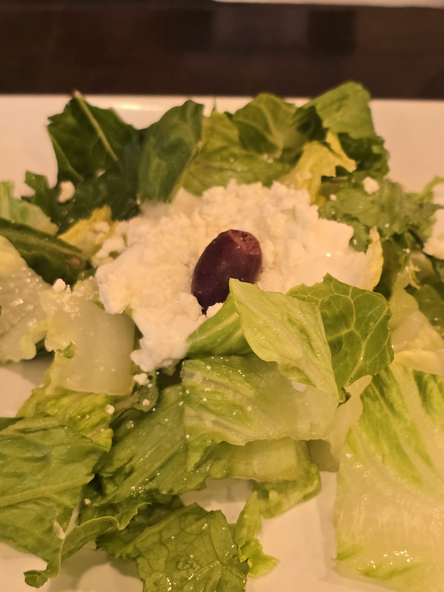 Salad The salad had feta cheese, letuce, and an olive on top. Wasn't a big fan of the olive as it was very acidic but i could remove it so no big deal. But the rest of the salad was simple and good.
