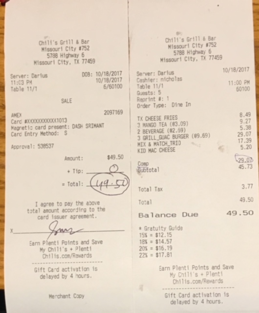 Read moreMy family and I typically come to this Chili's and usually don't have any major issues, but the last time was unfortunate... To start I ordered a sweet tea. When it got to the table, the bottom of it was almost clear. I stirred it up and took one sip and sent it back. It seemed like it was half sugar syrup. I ordered regular tea and that tasted weird because this particular location seems to have issues with their water. Oh well...