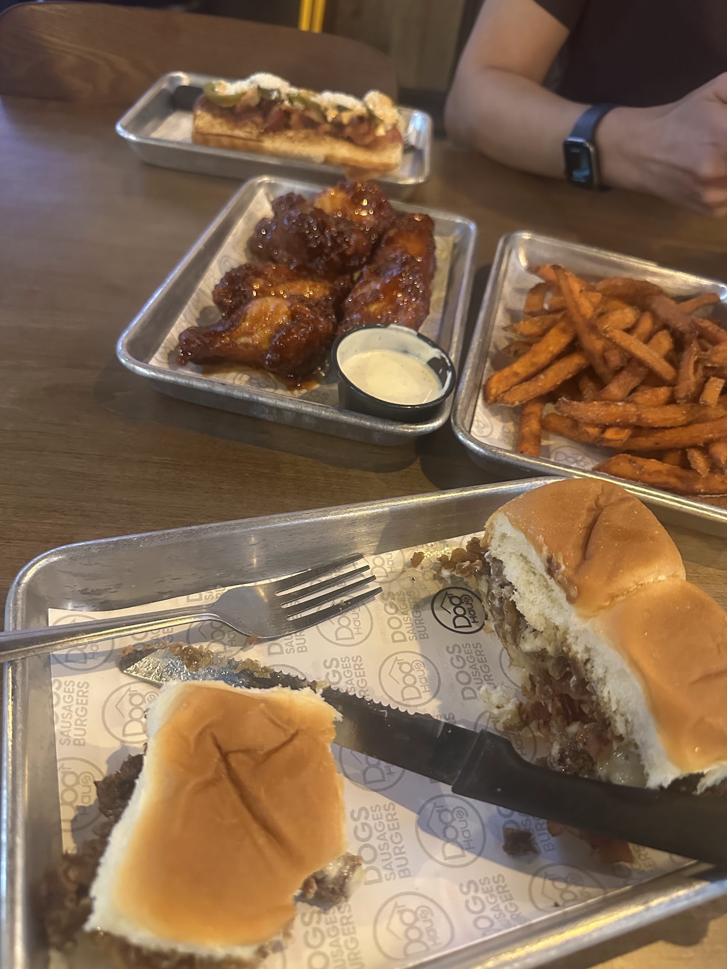 My favorite was the burger, good balance of sweet and savory, the wings were next with it being tossed in the hot honey, it was super crispy with a kick of sweetness with spicy, the sweet potato fries were pretty standard, but the least favorite was the hotdog. For a place named Dog Haus, I was expecting to be the star of the show, but it felt like an afterthought. It’s a very basic dog and then toppings added on. Depending on which variation you pick the toppings can be amazing, but the dog itself was bland.