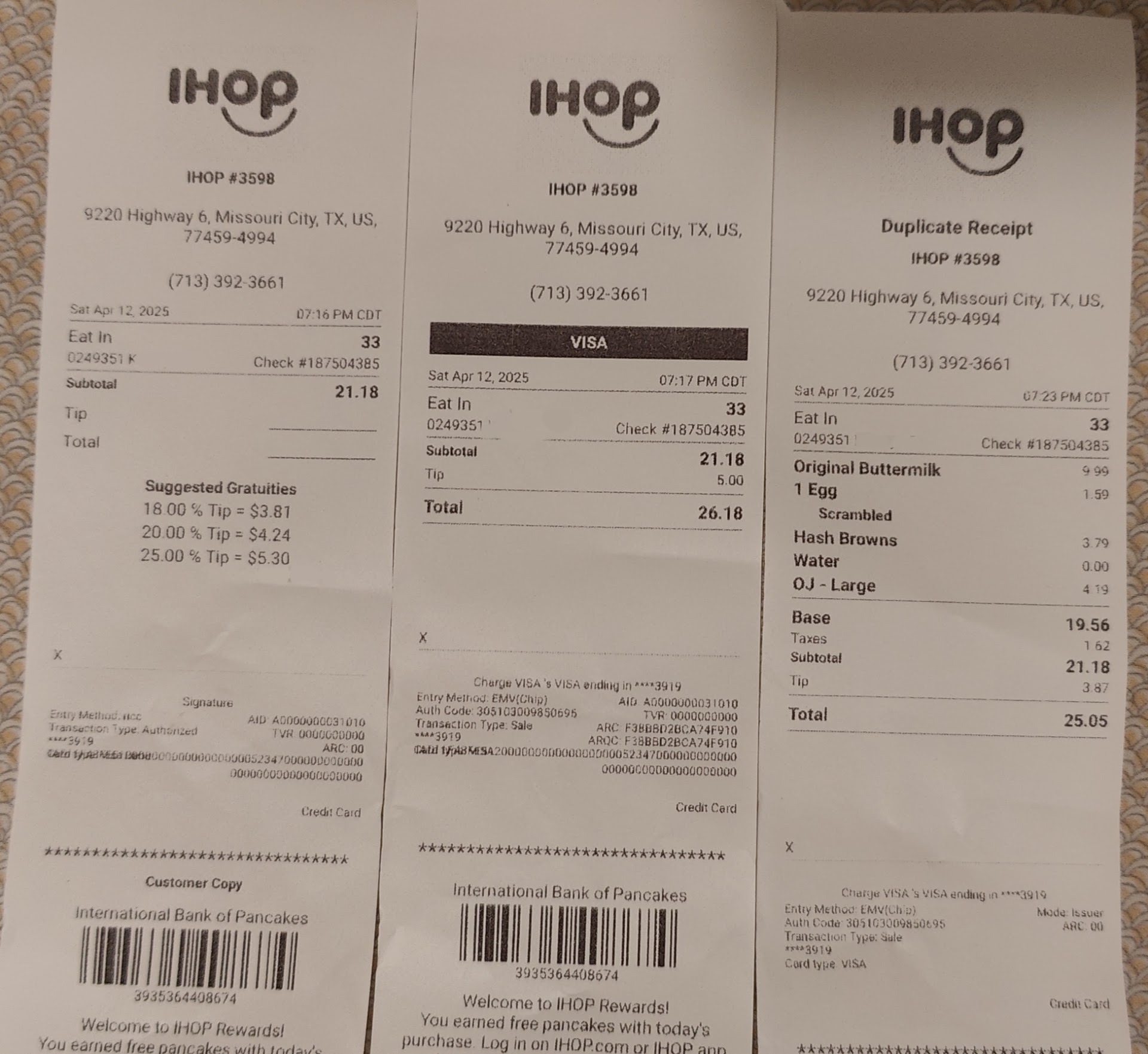 Read moreI wish I could leave 0 stars. I'm leaving this review after several failed attempts to contact management. I went to this ihop on late Sunday morning and myself along with 3 other parties stood at the door and waited to be greeted & seated. There were 2 hostesses at the front, 1 was on the phone and the other was standing nearby talking to a waitress. Neither of them acknowledged us. Finally the lady in the other party said " I guess we are invisible and they walked out." The hostess that was not on the phone then said, "we'll be right with you" but continued her convo. Another 3 mins or so pass and we are listening to the waitresses argue back and forth about who is taking what table. Another party left and I should have followed my 1st mind and left too but my kids really wanted to eat there. Finally started after a 15 min wait. The waitress comes over and seems a bit annoyed but takes out order. She isn't rude but isn't friendly either. Food took over 30 mins to come out even though there are not very many ppl inside the restaurant. We eat, get a box for left overs and I ask for the check. The bill was $25.18. I give the waitress $100.18, she brings me back $73. I said, this change isn't right. She walked off. She passed by my table again and I ask for a printed receipt (cause I know I'm not tripping) she takes about 15 mins to finally bring it back. I ask another waitress for the manager she says okay and walks to the back, but doesn't return. I took the $10 tip of the table put it back in my purse and leave. Since she shorted me and refused to make it right, I let her keep the $2 tip and took back what I was going to give for her mediocre service. I'll just stick to the ihop in Pearland. It's a longer drive, but much better...