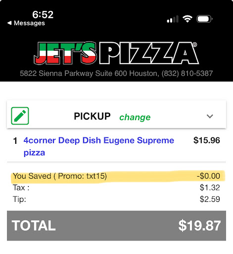 Read moreTried it a few days after they opened and the crust was a little chewy or seemed a little under cooked however the toppings and sauce were amazing. I decided to wait and try it again when some kinks were worked out and ordered Well Done. Well I am glad I held my review until now. ( I am glad I didn't roast y'all to soon like I have in the past with other businesses ) You pay more here at Jets. There is no 2 Speciality pizzas, wings, bread etc... for $24 something blah blah blah.. However what you get is the closest to fresh as possible. Compare it to The Gypsy Poet and Star Pizza, however the sauce is better than Star and the serving size is larger than Gypsy. Make sure to get your Crust Well Done, its burnt just right and perfectly crispy. I was hesitant to come back and glad I did. See y'all...