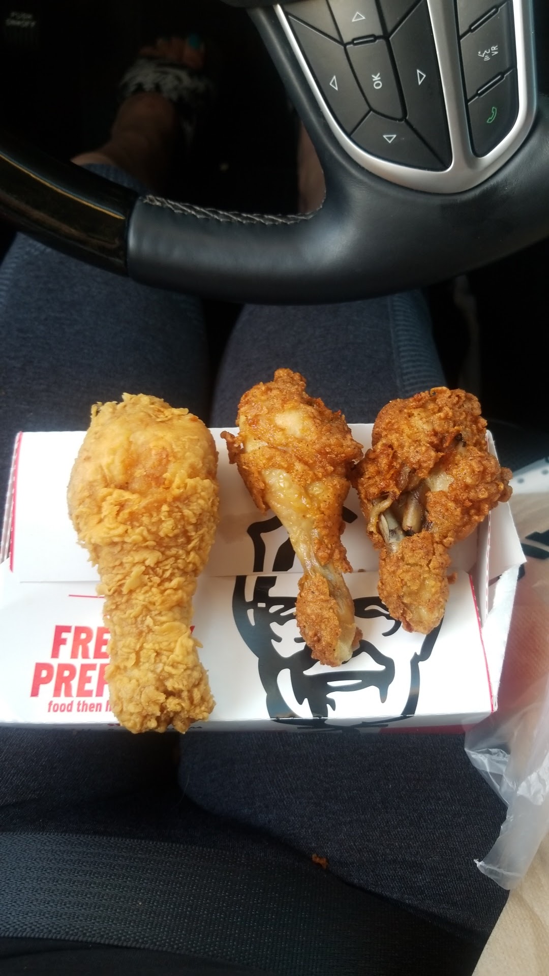 I purchased two - 3 piece meals. 1 all dark, 1 all light. Since it took a few minutes I assumed they had to maybe finish cooking or something. So when I got the order it didn't occur to me to check it. When I got it to my destination, about 2 - 3 minutes away, and pulled the bottom box out of the bag the bottom completely broke out and I noticed both boxes were pretty saturated in some type of fluid assuming it was a combination of grease and condesation caused by the plastic bag. Even the tissue they use in the bottom was falling apart. Checking the other we found it soaked too. We also noticed the crust was not even sticking to the chicken and we did not receive any dark meat in either. We tried to eat it but it was unedible. Since I just worked a dbl shift at the hospital and we were at a newly purchased home remodeling I figured I would call later and we would make do with biscuits (soggy too) and sides. No silverware anywhere to be found and we only had items we were remodeling with. We kinda ate the sides like 2 animals since we were starving and moved on to our work. Leaving we tossed the remaining dinners in the trash outdoors. Again, due my schedule, I was finally able to dig out the receipt and call Sunday. Upon speaking to the manager she insisted repeatedly that I bring in the dinners which have been in an outdoor trash since Thursday! Not only would I ever get the smell out of my leather interior but I don't think customers would appreciate me coming in the store with it! I'm quite sure it is full of maggots as well. So I'm off to our remodel house to dig in the bottom of the trash can to take a photo on, my ONLY day off!!! I'm hoping there is not too much on top! How freaking ridiculous! I have never been to this KFC and will no longer go there or any other. If I could give less than 1 star I would! Nice clean atmosphere but don't let it fool you!!