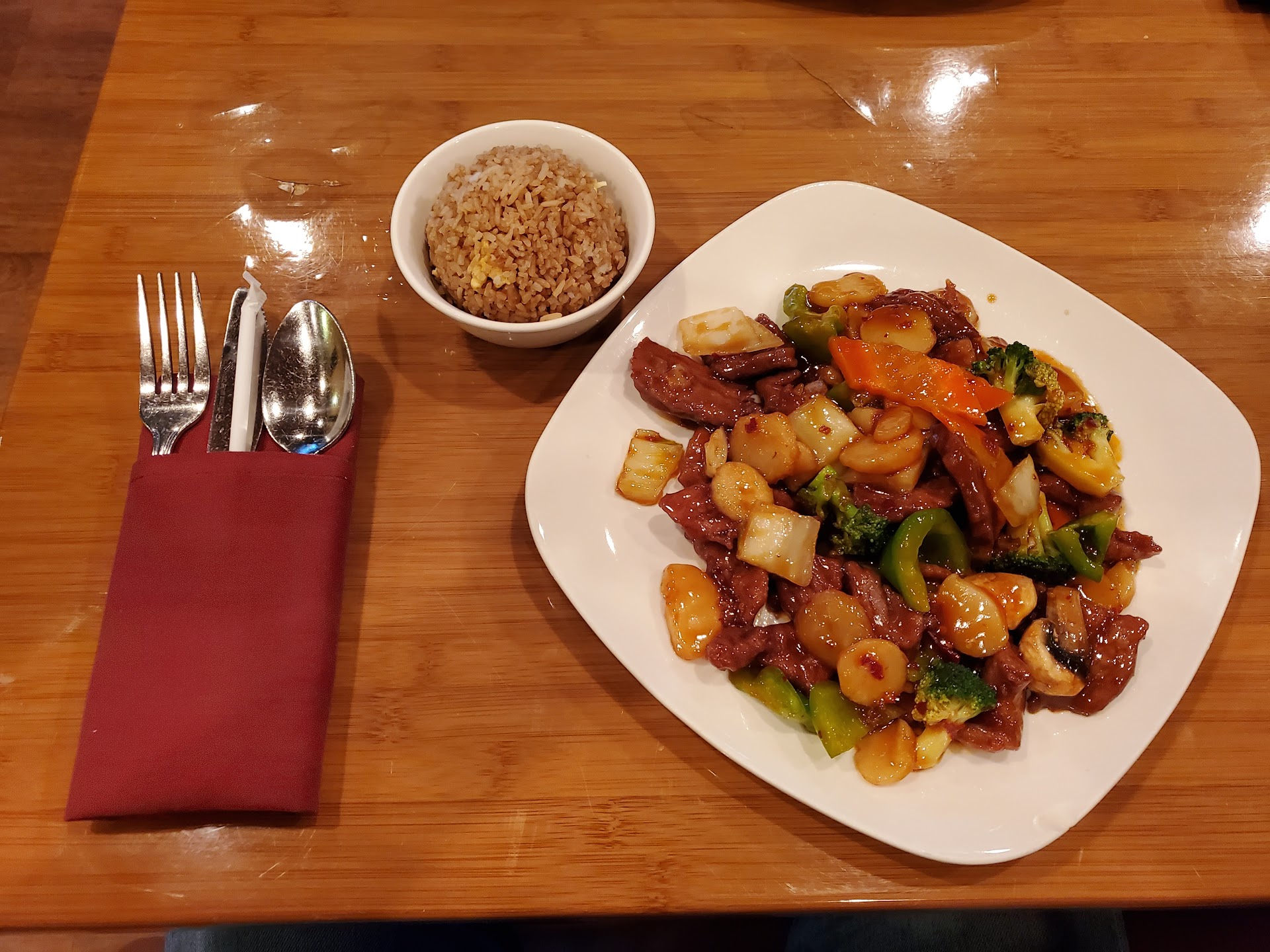 Ordered the garlic shrimp from their lunch menu, which came with eggroll, soup and choice of steam or fried rice. Hot and sour soup lacked the tartness. Eggroll was bland and required dipping in a sticky sweet sauce. The shrimp entree was lathered in thick sweet soy sauce which is what's stereotypically served at smaller Chinese restaurants. If I had wanted a sweet sauce dish, I'd have ordered a sweet and sour entree.