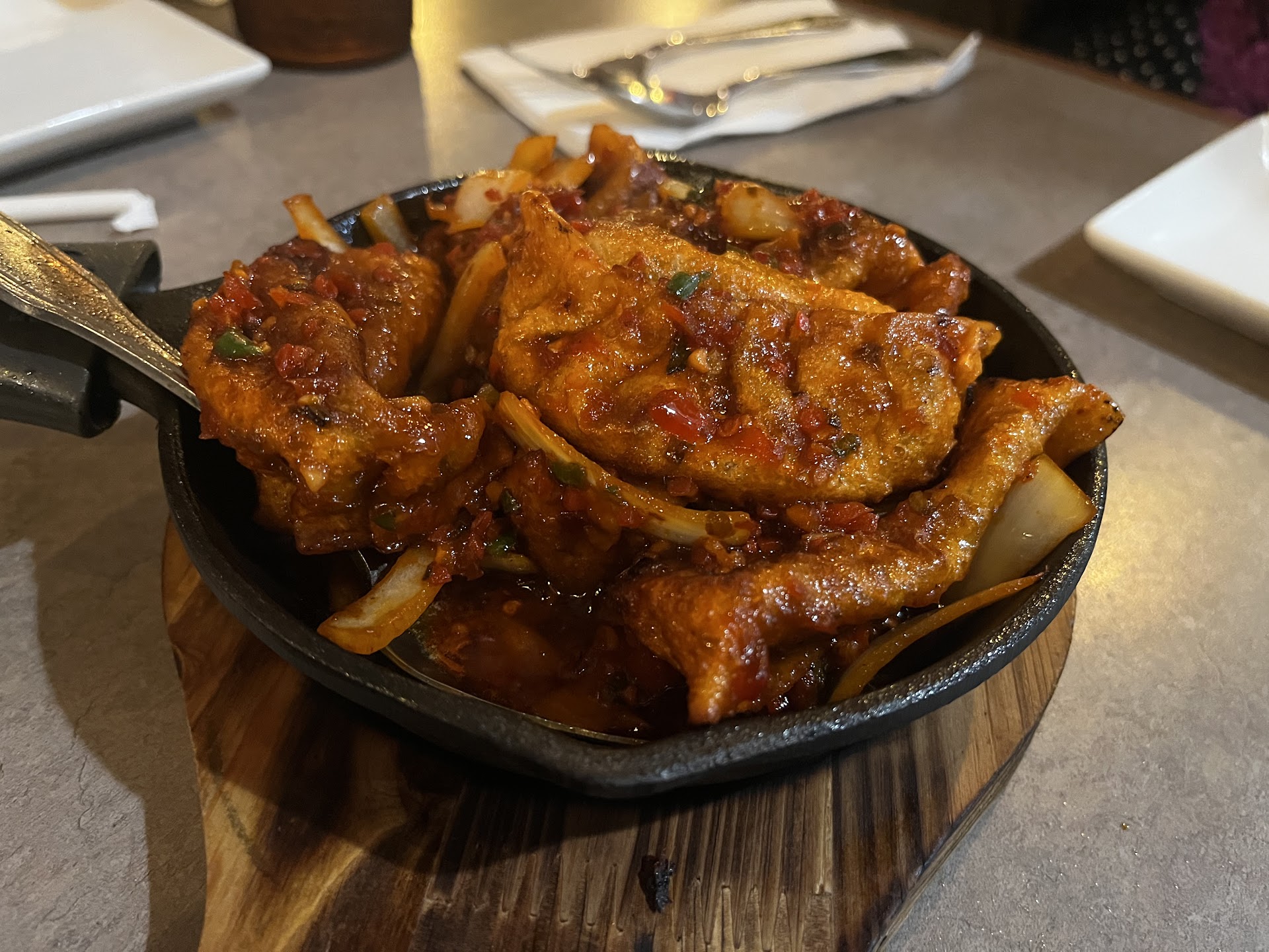 Vibe: It has festive decor with touches of gold, navy blue and island rattan light fixtures. The location is convenient: on Hwy 6/Dulles in between Missouri City and Sugar Land. Our waiter and servers were polite too. It was a busy packed restaurant which is always a good sign. Their meat is halal and they are a Chinese Indian fusion restaurant fyi.
