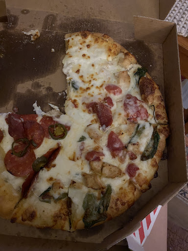 this location has gone massively down hill. my last experience was horrific, as the driver left my order on the ground, outside of my main building door, despite the main door being left unlocked for them to deliver it to my actual door. did i mention the ground was wet? decided to give them another try today and was also disappointed. made a half and half pizza with EXTRA pep and light jalapeño on one side and chicken/spin/tom on the other half. as you can see the one half is skimped on the peps and the other half was THROWN together. pizza was floppy and toppings falling off. thank god for the prepackaged salads they offer, because that was the only âgoodâ thing about this whole ordeal. not to mention, was quoted 64-74 mins on delivery time, my order arrived close to 90 minutes after i placed it. all i ordered was 1 pizza, 1 salad & 1 two-liter⊠wow. the delivery driver didnât even offer an apology. wonât be returning to this location...