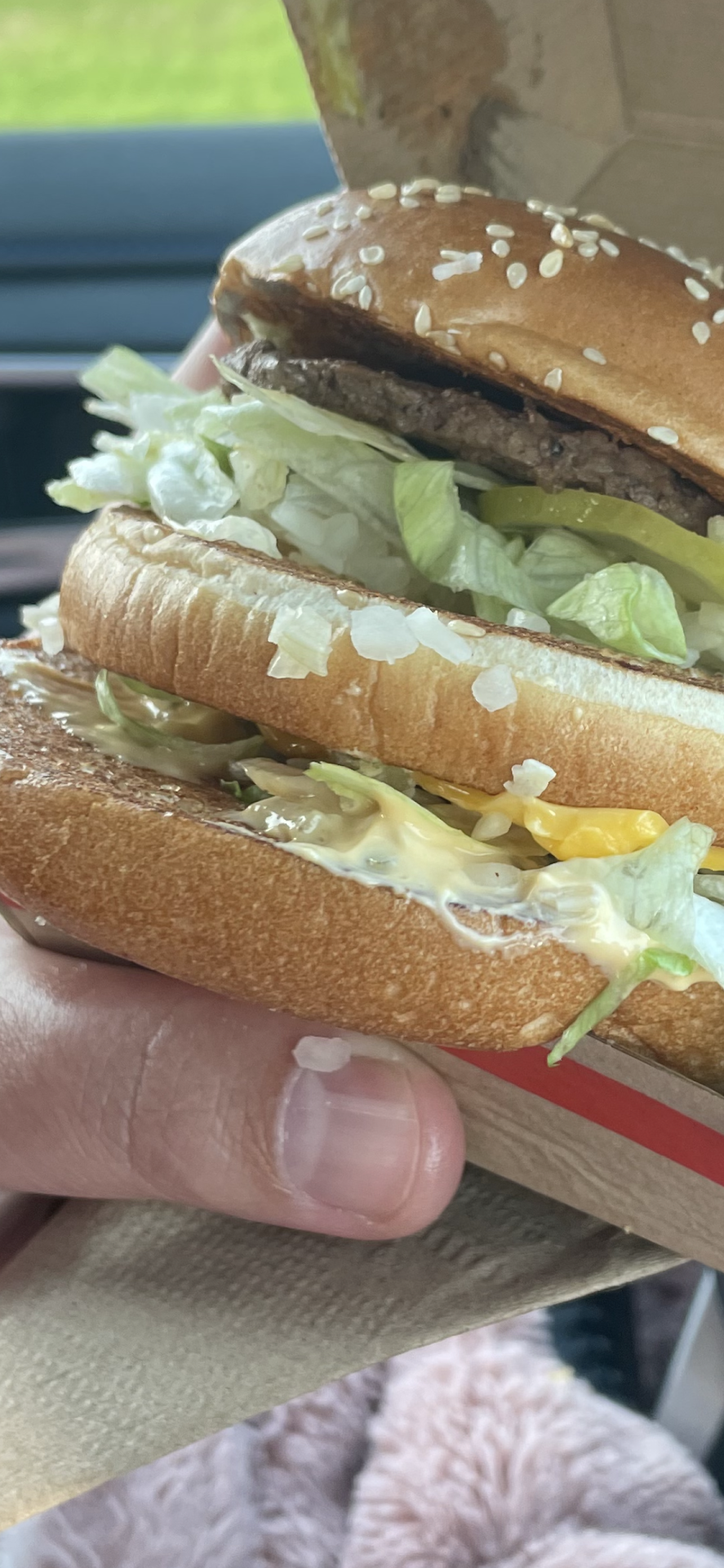 I went to the restroom quickly and upon my return, I was given my drinks, in a cupholder, and my bag of food. I wondered about the food being so fast. When I ate my hamburger, it was still pink in the middle. Other than that, our order was correct.