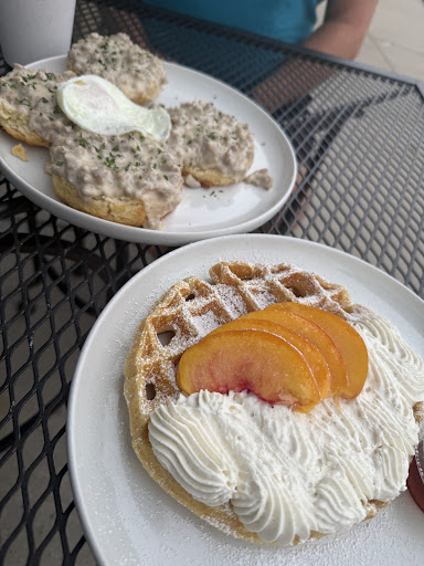 Today I had the biscuits and gravy. There was plenty of tasty sausage in the gravy, and the biscuits were crispy on the outside and inside were light and fluffy, with excellent flavor. I also added and over medium egg today. My wife had the peach waffle which was also light and airy, served with plenty of not-overly-sweet whipped cream and fresh, ripe peach slices.