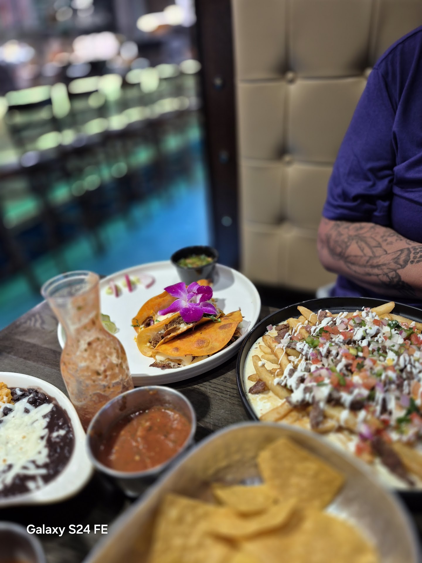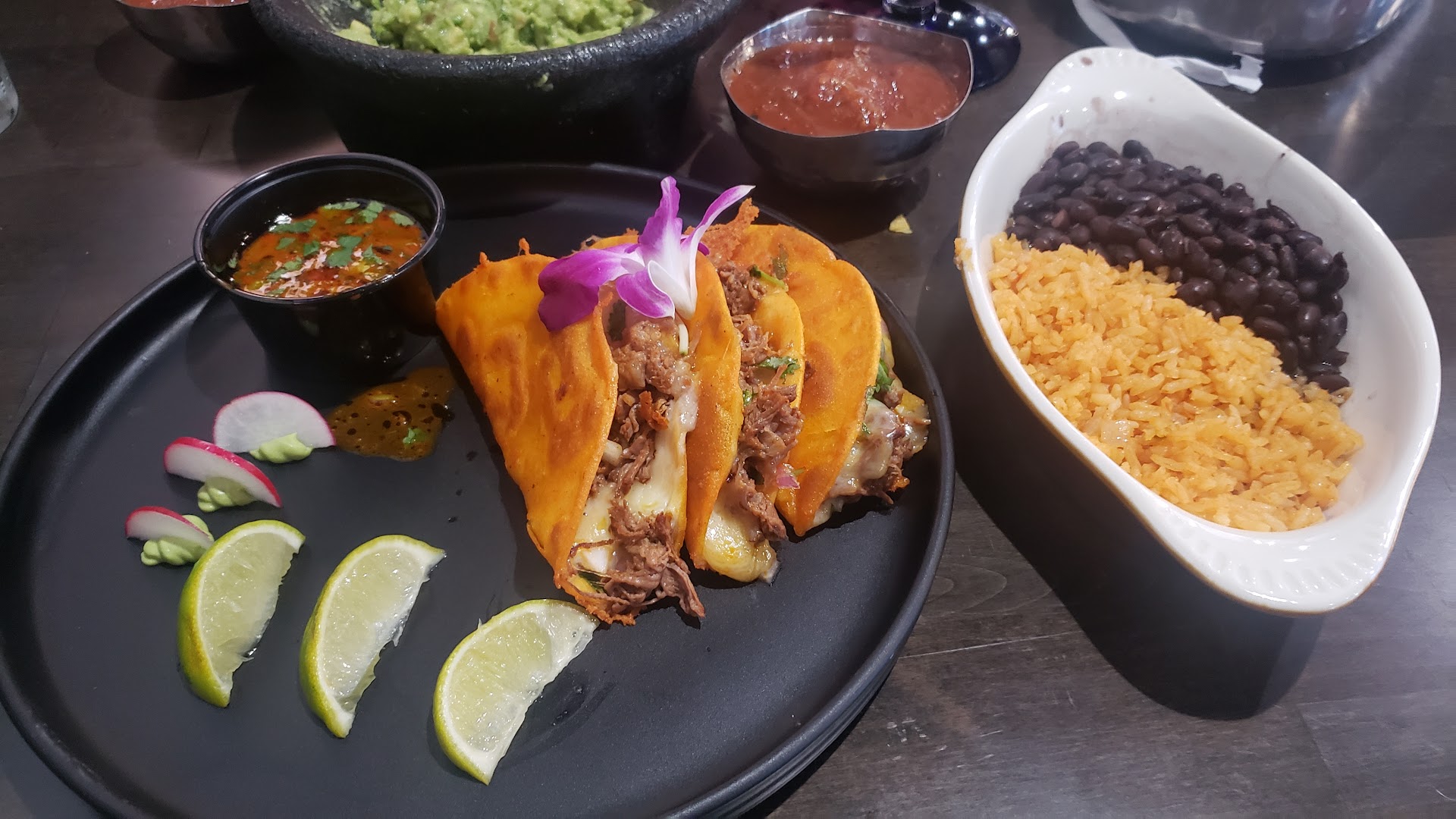 We went second day of opening at 5pm. We had chips and salsa and ordered queso. Which came out fast and hot. The queso was very delicious. We ordered two drinks a mango margarita which came with a beautiful dried orange slice and a drink made with house beer with mint which were delicious! Those also came out fast. Our sever was very nice, accommodating and went above and beyond. We ordered the quesa birra and the shrimp tacos off the street taco menu and they both came out fast and very hot with rice and beans. The presentation of the meals were so nice. As the shrimp came out with a beautiful purple flower. Both meals were so good we actually finished our meals. Overall would go again only for date nights. The menu was very different than what I’m usually used to looking at. But I don’t see that as a bad thing. Can’t wait to come back to try more food and drinks, we did not try the table side made...