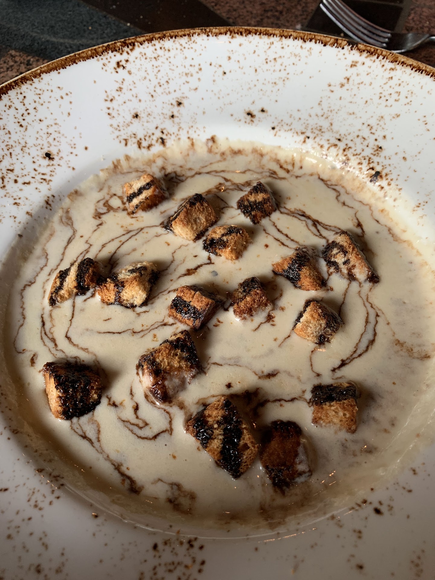 Garlic balsamic soup subtle creamy soup with a sweet balsamic finish interrupted by crunchy cornbread croutons. This was a highlight of the meal with textural complexity and a balance of sweet and sour we both really enjoyed this dish.