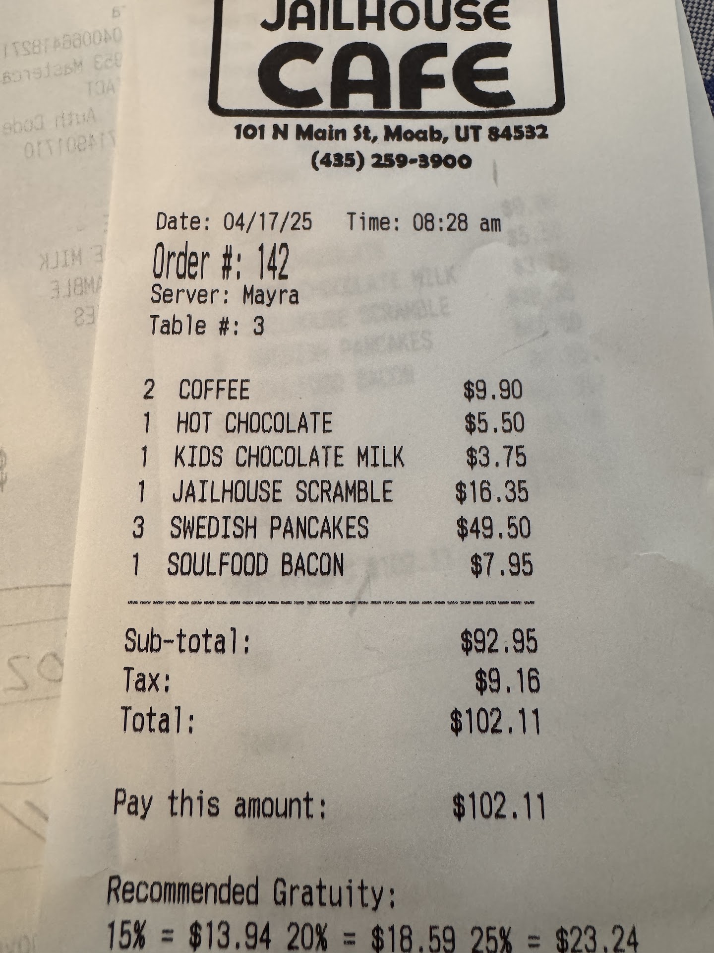 Read moreWe have eaten here a few times over the years during Easter Jeep Safari and this week Rally on the Rocks. Until today everything was good. Today we sat in the back where the staff puts up the clean silverware, glasses and coffee mugs. We watched the same bus boy wipe his hand across his nose, blow his nose and pick his nose the entire time we were there and each time right after pick up clean silverware to put on tables, put clean glasses away and pick up coffee mugs...all clean. Not once did he walk away to wash his hands. After seeing that I took out antibacterial wipes and cleaned all the silverware on the table before we used it. When the food came one of the omelets had tomatoes in it, we asked the waitress to have a new one made. She very nicely took it back to the kitchen then brought it back out and told us the cooks said they were peppers, not tomatoes. So we picked out all the tomatoes and had her take it back to show the cook what a tomato looks like. We asked to have it taken off the bill as by then we didn't want another scramble. We never got the side of bacon, salsa or butter that we asked for and the short stack of pancakes came when everyone was done eating and plates had been cleared. Sad that one really bad experience will keep us from...