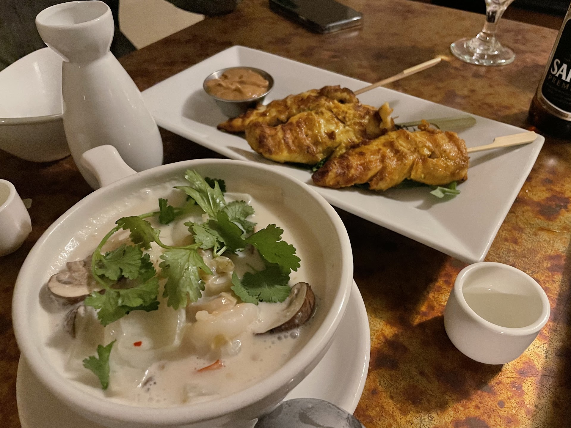 Appetizers Crispy Egg Roll - fresh and tasty Tom Kha Soup - awesome! It was flavorful, rich, and satisfying. Not spicy at all, but with chili powder provided on the side we tuned it to our liking.