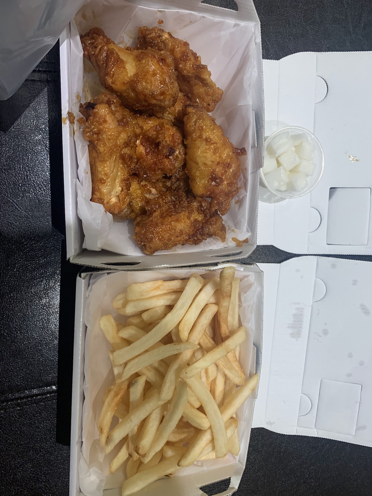 Our order: Boneless lunch combo w/ Honey Garlic wings, fries, and drink Boneless lunch combo w/ Galbi wings, steamed rice, and drink