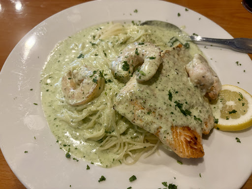 I ordered a Salmon dish that rested on a bed of house made angel hair pasta and covered with a delicious house Alfredo sauce and wifey ordered a shrimp dish that consisted of some HUGE gulf shrimp on top of some cheese ravioli. Both dishes were served with hot garlic bread and everything was outstanding. Portion size was very generous, too.