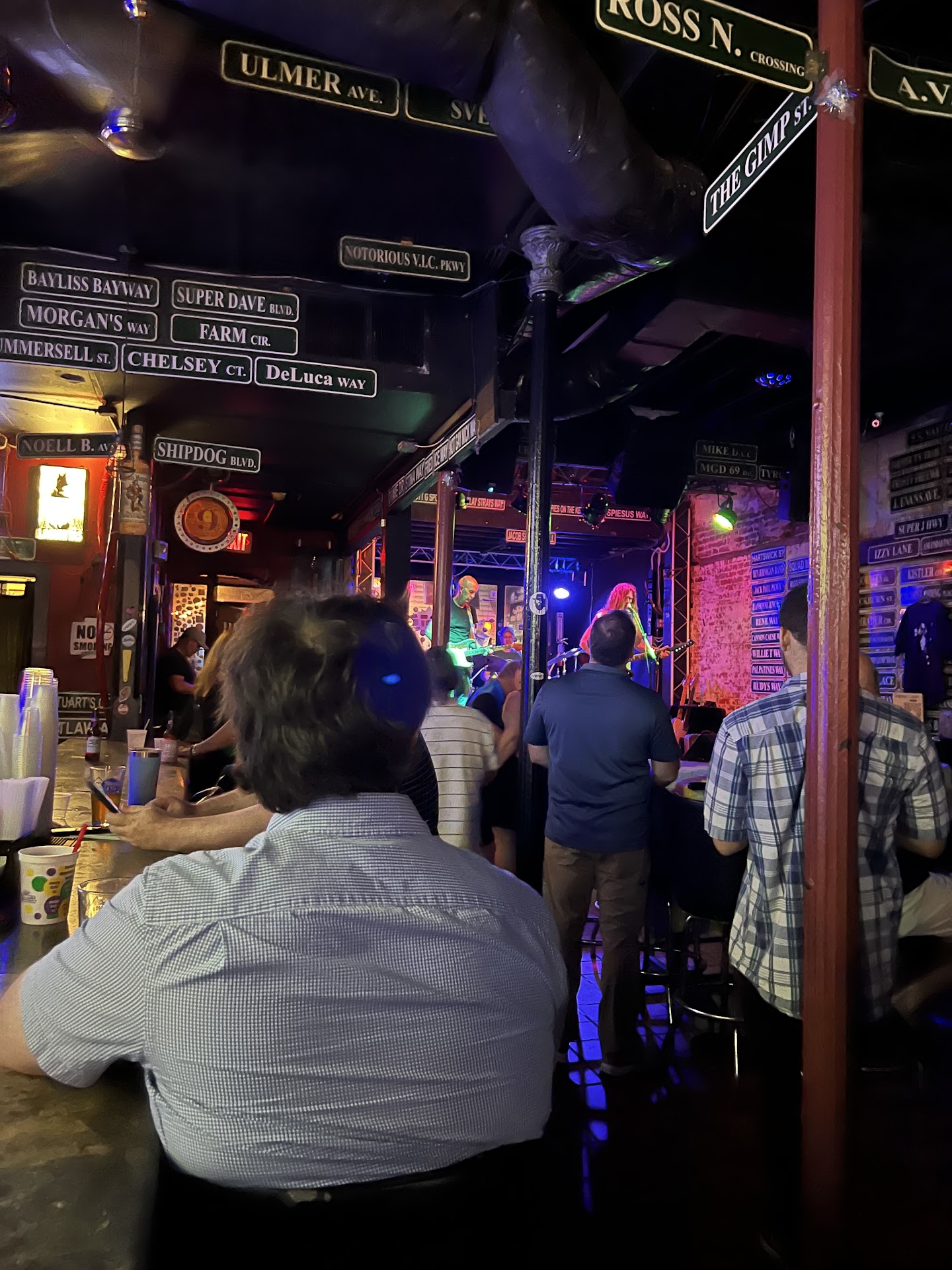 old building that has been renovated into a bar, very high ceilings, stage at 1 and has a small dance floor. there are two pool tables in the front of the bar, also people were playing what looks like Beach games out on a back patio/deck, but I didn't go back there. Everyone got carded as they came in the door... And I mean everyone, LOL! I felt the staff was very attentive. The clientele had a pretty steady turnover over the course of the evening, broad mix of Ages from 20s through 50s and even a sprinkling of musicians types who were older than that. What's up with people who were in weddings that then go out to bars after... Based on bridesmaid dresses, there were remnants of three different weddings over the course of the evening ( two of the dresses were not something I would have worn out in public, much less do a bar, but then nobody invited me to be in the wedding, LOL. Maybe it is a Rite of Passage for the area, IDK, I'm not from around here.) Smoking is allowed in this bar. But there are really powerful ceiling fans so in theory you should not be getting a face full of smoke if a smoker settles next to you. finally, was a really good blues/southern rock band, but even the music that played between the band sets was good,...