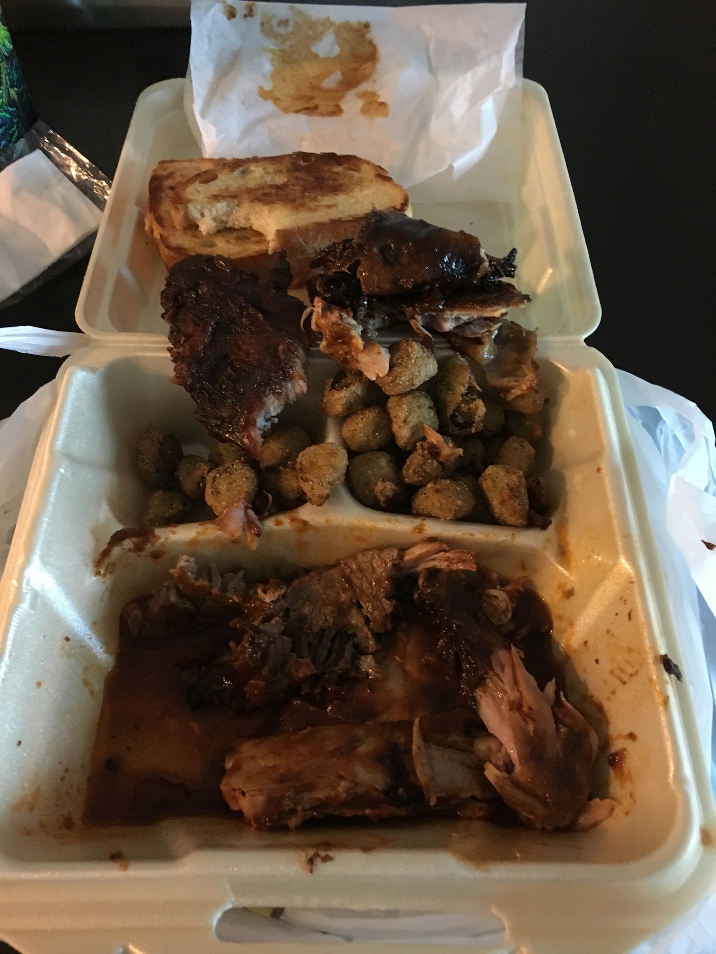 Well, the place smells like smoke as you walk up, usually a good sign. I'm not sure what they're smoking in there cause it can't be the meats! I ordered up a super sampler hoping I'd have some tasty leftovers. Nope, it's all going in the garbage. I'd go back and demand a refund, but they seem like the kind of folks that wouldn't understand. I went here cause Google has them pegged at 4.2. Google doesn’t usually let me down, but today Google and I aren’t talking. Who is so tasteless as to give this place any rating at all? The ribs were extremely chewy and exactly like my friend does them in the oven when he cooks them in 2.5 hours, no flavor. The beef was dry and roast like, not smoked brisket in any capacity. The pork shoulder was more like a roast and definitely not pulling apart. The chicken tasted as if cooked over charcoal that's barely alive, not a smoke flavor, but like eating carbon monoxide. None of the meat had a smoke ring. When I asked if there was sauce in my go bag, they asked if I wanted extra and informed me that they slather it in sauce for you. No respectable barbecue joint does that. They let you decide if the meat requires it. The sauce sucked and was run of the mill. The garlic bread was hard as a rock, maybe been sitting for three hours in a warmer. Couldn't even bite that bread. Finally, my fried okra was dry, they didn't offer me ranch or anything for it. Don't just...
