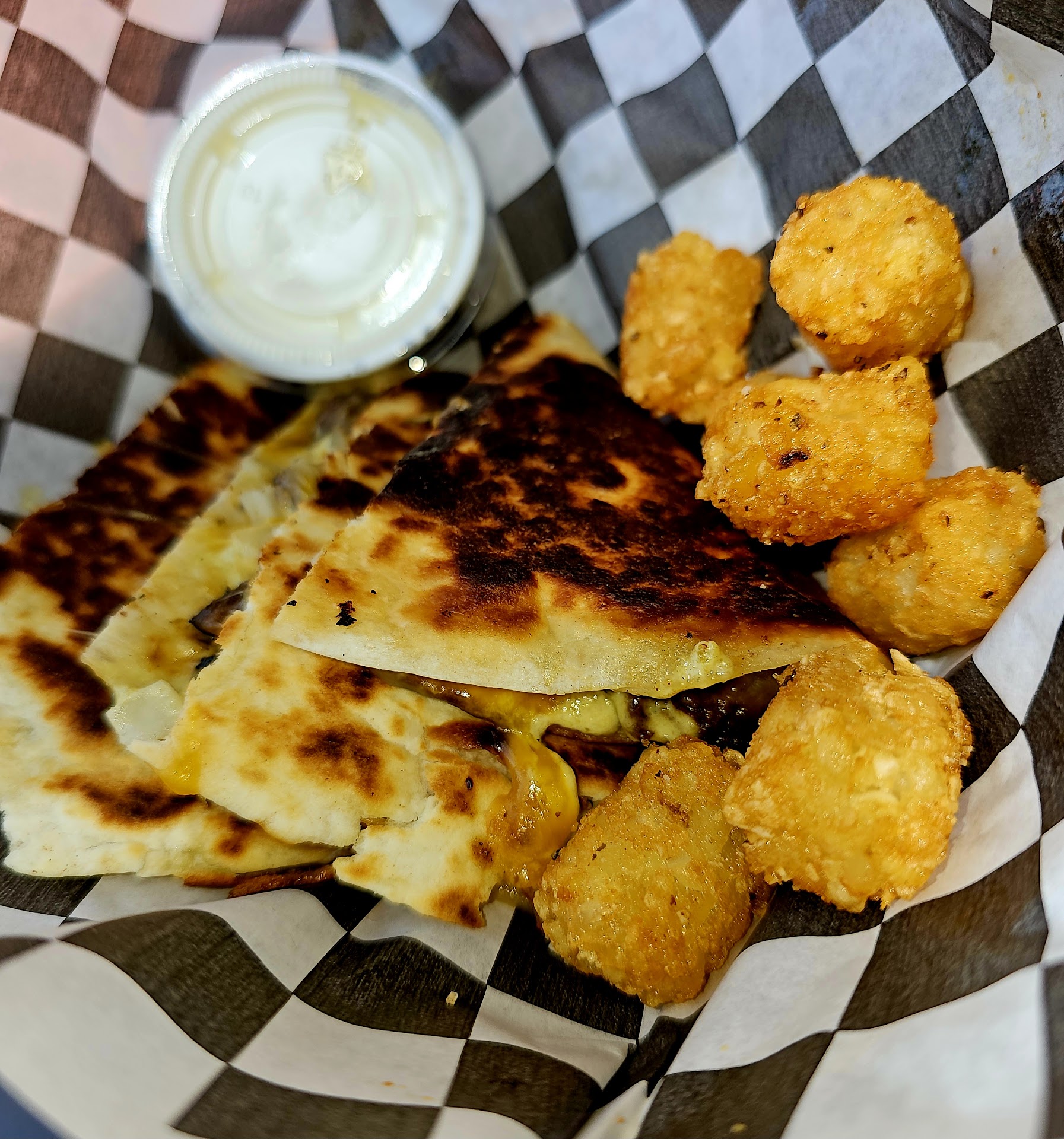 I had the tasty pleasure on a beautiful Saturday to try Front Yard Taco's. The outdoor location is so cute to me. It's located right next to a coffee shop (in my opinion, that's a bonus). I didn't really want much. I was curious about the food truck / restaurant in the yard. Well, all the hype I heard was true! The food I got was served hot, the cashier was friendly and it really did taste good. My order was simply a Carne Asada quesadilla ( no avocado), some Tator tots, and the "Not ranch" sauce. I was one happy camper when my food arrived! First, my quesadilla was loaded with meat, cheese, and the veggies listed. These folks did NOT skimp on the meat and cheese. Everything I ordered was cooked to order, hot and fresh. Yippiee! Now, one super delicious treat of all, that I actually pray that they bottle and sale some day, is that damn delicious "Not Ranch!" Whew, chile, fresh dill was in there for sure. It reminds you of ranch but more flavorful and zippy. I got an extra side of it to take home. Get on over to Front Yard Taco's and eat some of the goodness! Definitely order an extra side of...