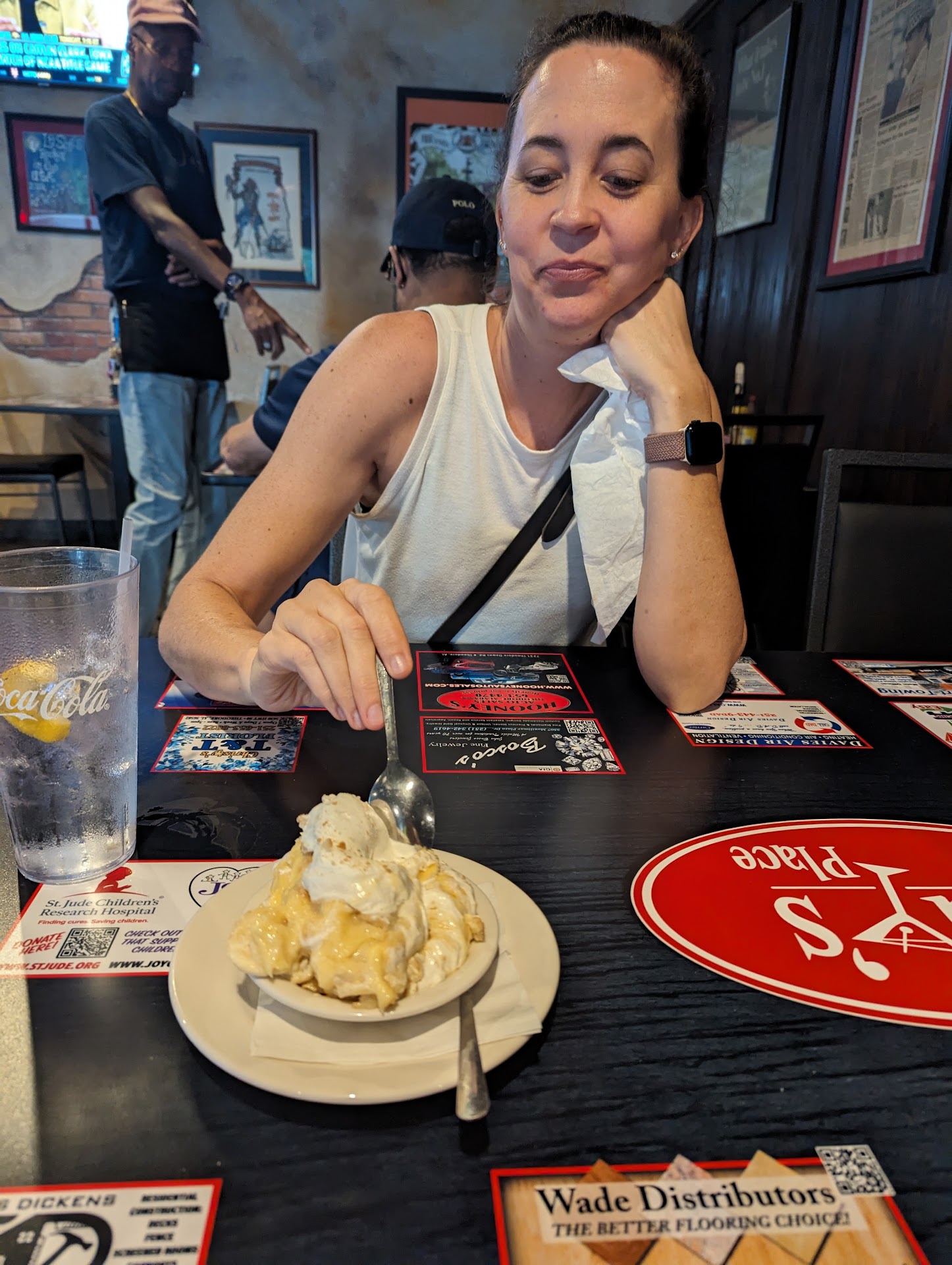 The food was hit and miss. The sweet tea wasn’t sweet. The mashed potatoes were instant potato pearls- cheap, artificial flavor and texture. The green beans were canned, but they were very well-seasoned. The mac & cheese was homemade and pretty good with some extra salt. The country fried steak was ground beef, not actual steak shank. It was seasoned well, but I’d rather pay for the real thing and the right texture. The gravy on the “steak” was really good. The roll was frozen premade. The banana pudding was really good (by far the best part of the whole experience).