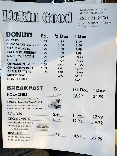 On 3/9/24 I went to the lickin good donuts on Cottage Hill Rd. By Adorable Do's it was around 10am the server never greeted me. I asked for two maple glazed doughnuts with bacon and a sausage kolachie. When I got in my car I noticed that the maple glazed didn't have any bacon on them. I went back in and the server said that I had asked for plain maple but I didn't I even pointed at the ones with bacon. He threw the plain ones in the trash and gave me the bacon ones. Then when I returned to my car I find that my kolachie was ice cold. I just waited until I got home to heat it. I've never had this kind of service at the one on Hwy 90 close to Azalea rd. I'll not be back to this location. Based on the...