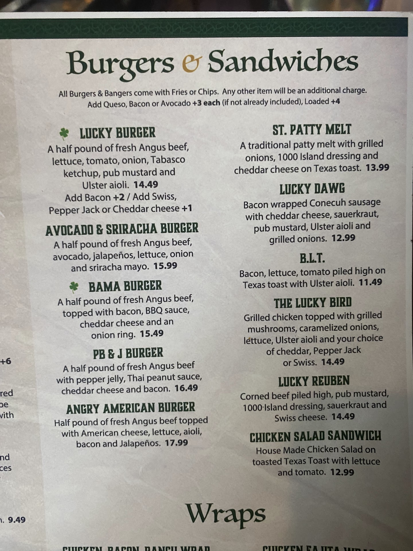 Lucky Irish Pub & Grill offers a classic pub atmosphere with a touch of Irish charm, making it a great spot for both locals and visitors looking for a relaxed dinner or a casual night out. Located at 3692 Airport Blvd in Mobile, the pub greets you with friendly staff and a unique setting—walls adorned with dollar bills, each carrying its own story, adding to the cozy, lived-in vibe. Food & Drink The menu is packed with pub favorites and a few Irish-inspired classics. The chicken wings are a standout—juicy, flavorful, and generously sized, with sauces that deliver depth and umami. Many regulars rave that these are the best wings in Mobile, and after trying them, it’s easy to see why. If you’re a burger fan, you’ll be pleased with the options here. The burgers are fresh, not frozen, and come with limitless combinations of toppings, served alongside crispy fries or some of the best onion rings in town. Other highlights include the Bangers and Mash, which is cooked to perfection, and the shepherd’s pie, served in hearty portions and full of flavor. The menu also features wraps, sandwiches, and classic pub appetizers like fried pickles and mozzarella sticks. Atmosphere & Service Lucky Irish Pub & Grill strikes a balance between dive bar and welcoming neighborhood hangout. The staff are attentive and personable, often remembered by name, which adds to the sense of community. The bar is decorated with Irish touches and has TVs for catching sports—rugby and soccer are often on, adding to the authentic pub feel. While the atmosphere is generally laid-back and pleasant, some reviews mention that the vibe can be a bit hit-or-miss depending on the crowd and time of visit. Summary If you’re after a hearty meal in a no-frills, friendly setting, Lucky Irish Pub & Grill delivers. The wings and burgers are must-tries, and the Irish-inspired dishes round out a menu that’s both comforting and satisfying. It’s a place where you can unwind, enjoy good company, and savor classic pub fare...