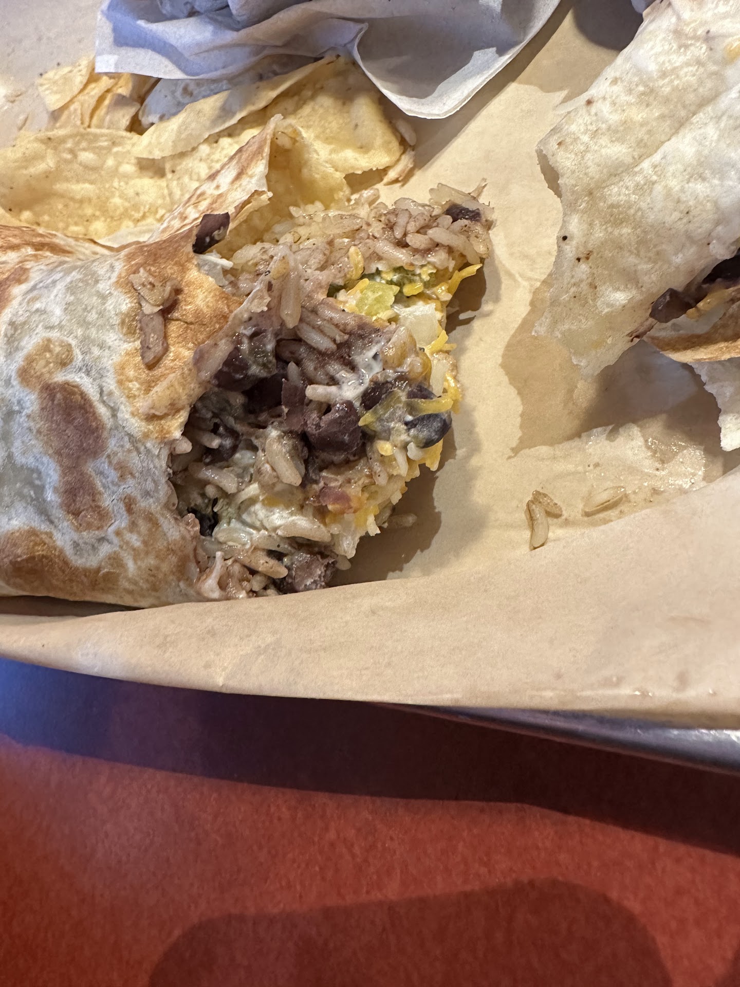 Read moreThe good first: the food was what you'd expect from Moe's and we got what we paid for. Now for the not so good: As we walked in the door we were not greeted with the typical "Welcome to Moe's!" that is synonymous with entertaining a Moe's. We should have taken the hint and eaten elsewhere. There were 3 staff members in the restaurant and only one person in line being served. We waited at the end of the counter to place our order. After several minutes of waiting, one of the staff stopped chopping vegetables and came over to take our order. She wasn't rude but was obviously bothered to have had to stop what she was doing. Orders placed and food served we found a relatively clean table in the almost deserted restaurant...no obvious trash left on it, but it had not been wiped down in recent history. Then to get our drinks only to find out there was no ice. As we ate no other patrons came in and the staff gathered in a booth to chit chat, rather than filling the ice, cleaning the tables or floors. We...