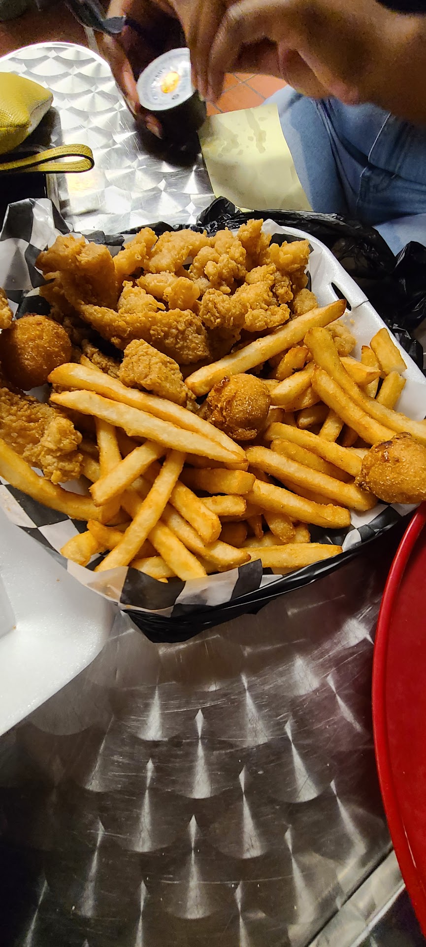 We ordered the 4 fish dinner with crab claws, shrimps, oysters, and fish (all fried) along with the gumbo and 2 pounds of crawfish. The gumbo was very good. Not too spicy. The crawfish was also very good. If you’ve never had crawfish, just think of a tiny lobster. All the fried food, while a touch similar, was very good and the breading was actually tasty, not just there. All in all, it’s well worth a visit, but the food isn’t night and day better than other seafood places in the area and it’s definitely not inexpensive.