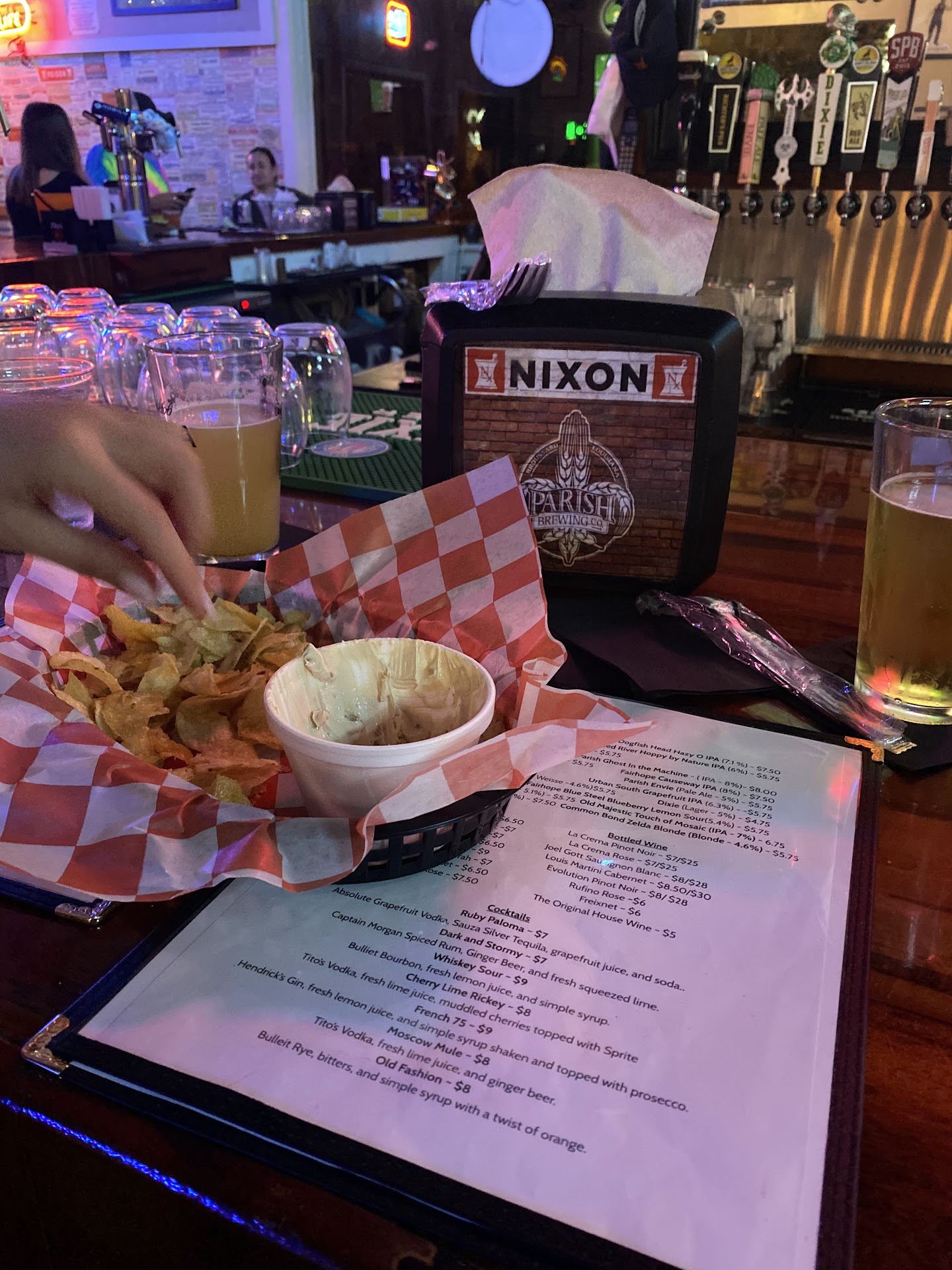 I absolutely love this place! This little hidden gem is on Old Shell Rd., adjacent from Dew Deop Inn, and let me tell you, this place is amazinggggg!!!! The food is amazing, especially the spinach dip. The spinach dip was the best spinach dip I've ever had. And the bread they have to go with it is sooooo gooooddddddd. The Mid Town Dip is soooo gooodddd as well. The roast beef and the dipping sauce are just perfect!!! The green beans are to die for!!! They are too good. They used to have collard greens that were to die for, but no, the green beans are just too good and perfect!!!! This place is just a vibe. It used to be a pharmacy, but it has that kind of an old timey feel to it with a modern twist. And Elizabeth was freaking amazing. She was so sweet, kind, attentive, helpful, and knowledgeable. She was so friendly and personable. She talked to us, gave us some amazing suggestions, and she was just so nice. She is honestly one of the best bartenders we've ever had/encountered. She's just one of those people that you would love to be friends with, you know? Nixon's also has a lot of good beers on tap, too. The Blue Steel beer was phenomenal and a great suggestion from Elizabeth!!! 10/10 definitely recommend...