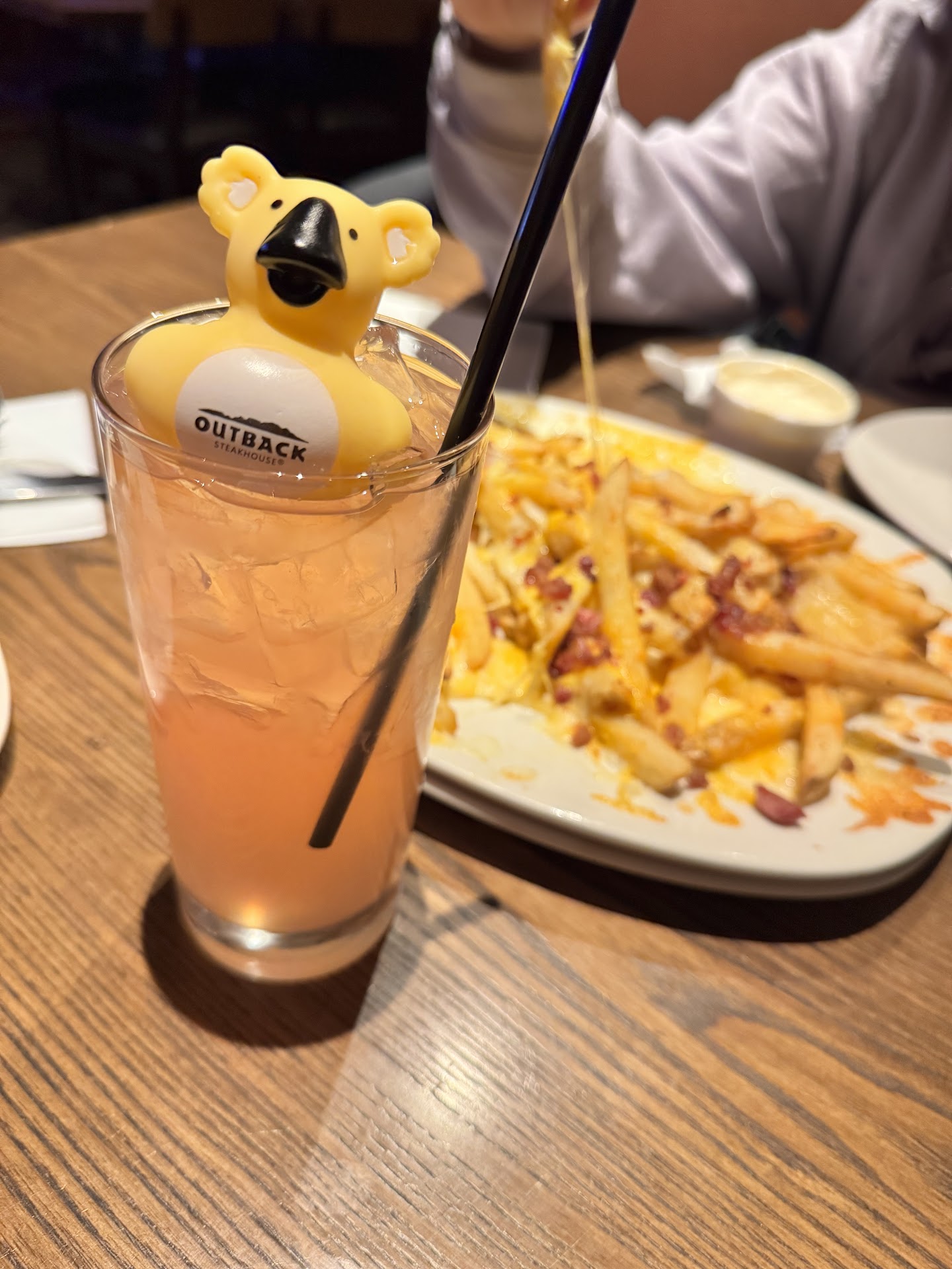My daughter and I stopped at Outback last night after the parades for a late dinner. It was about 9pm, so there was no wait and we were quickly seated. Nichole E. was our waitress and was amazing from the very beginning! She greeted us with a smile and within minutes we had our drinks and some warm bread. We ordered the aussie cheese fries (one of my favorite foods for over 25 years now), their new garlic parm chicken bites (seasonal menu), their koala cocktail for me and a soda for my daughter. The cheese fries came out first and were perfection! They were hot, super cheesy, and were delivered with the extra ranch we requested when we ordered. I wish there would be a little more bacon on them, but they were still awesome and we dove in! The chicken bites arrived looking and smelling heavenly! When I ate the 1st one I noticed that while the flavor was good, the texture seemed off. I know that can happen with chicken sometimes, so I didnât say anything, but a minute later I noticed my daughter spitting hers out because âthe texture was weirdâ. I never said anything to her about my 1st bite so I know she wasnât just saying that. She and I both tried another piece. Mine was fine, hers was still a little off, but she ate it. My 3rd bite was the final straw, it also had a weird texture, almost like it was undercooked, even though it was white when cut. We felt horrible saying anything to the waitress, but these were inedible, so we let her know. Nichole was insanely understanding about the situation and did not make us feel bad at all about it! She told the manager and they removed it from our bill and also offered us a free dessert to go (she knew we were tired from the parade). They went above and beyond to make it right, and based on the service and cheese fries we will definitely be going back! P.S. the koala drink is really good, especially if you donât want to taste alcohol. Itâs fruity and sweet, and the Outback koala duck you get to keep just made it...