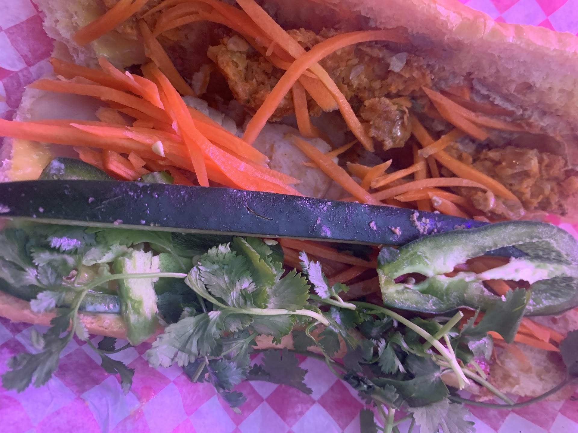 When I got home the first thing I noticed were the fries were very hot. I mean so hot I didn’t have touch them to find out. The box was on fire almost. They also provided ketchup packets. The fries were hot and delicious and not too salty. They had a real crunch that I like on my crinkle cut fries. Now the sandwich was a perfect complement to the fries. It was so delicious. I don’t have the name of the greens we’re on the salad but I’m pretty sure they’re used in a lot of Asian dishes that I’ve had before. The carrots added a little crunch to the sandwich as well. Now the meat part of the sandwich was glorious. The pork and other meats were blended so well with the spices that it created a very glorious taste. It was so...