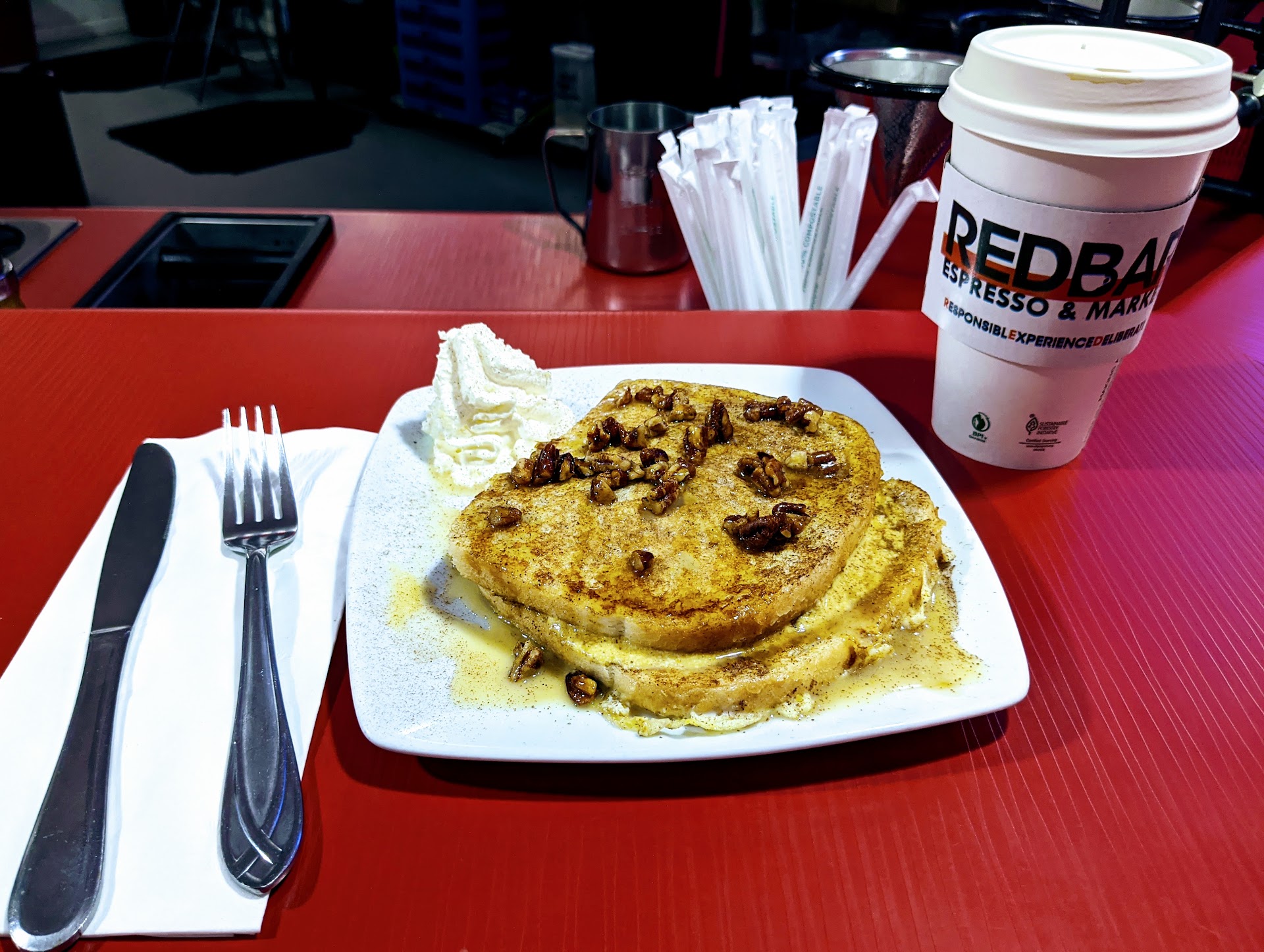We decided to come back this morning so I could get the French toast and my husband last minute decided he wanted the RED SEC! I walked in and one of the staff members recognized me from the day before! We also each got a latte and they were amazing!! I had pumpkin Friday night and did the maple butterscotch today and my husband did the vanilla. We loved that while there was some flavor to the latte it wasn’t overpowering and we could still taste the coffee!
