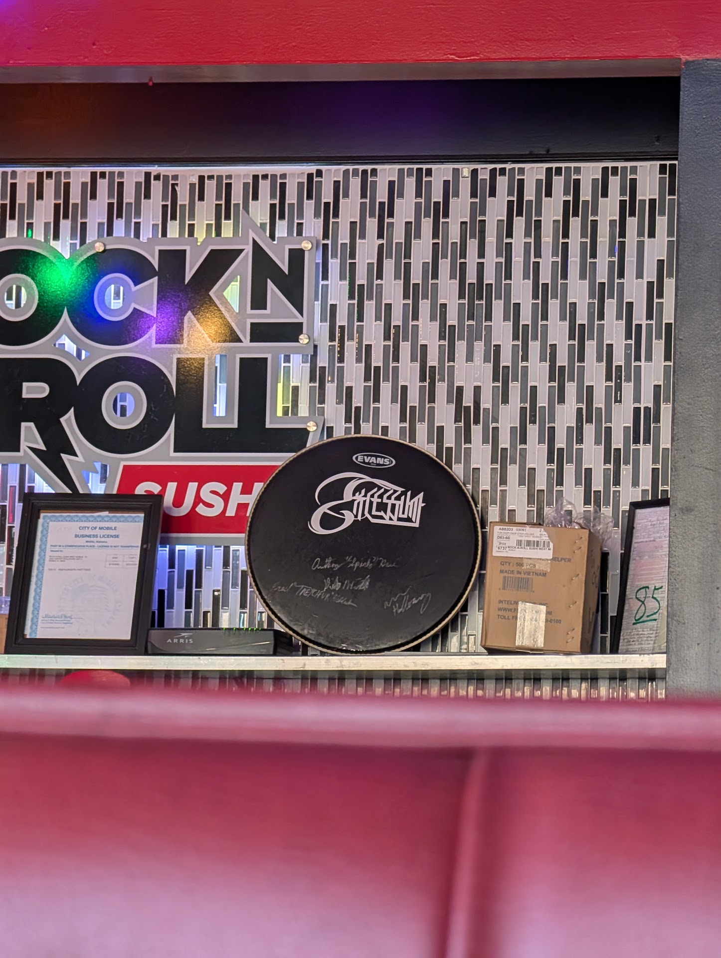 Theme being rock and roll, this sushi joint uses all the late and great bands and performers for names of the rolls. ** I had the Jimi Hendrix roll. With shrimp tempura, cucumber (or avocado, I can't remember pretty sure cuke) with cream cheese inside and fresh mango, sweet chili and eel sauce on top. I opted to substitute raw red tuna. Which I highly recommend....it was the perfect balance of sweet, heat, and umame (I know silly word but it's that Asian savory salty thing) it was great. I absolutely loved it!!! **I also had miso soup, also good. Typical miso no real stand outside but I still had no complaints. **The servers were all there w kitchen staff. Typical sushi bar thing in effect made right there in front of u. They were talking, I was alone, and completely included me as if I were part of the family. **My server Sarah was extremely nice and had great knowledge of the menu and nothing but smiles for me. **This place is underrated as far as I could see. Only one other table eating while I was there. Please do yourself a favor and visit this local business as it is a...