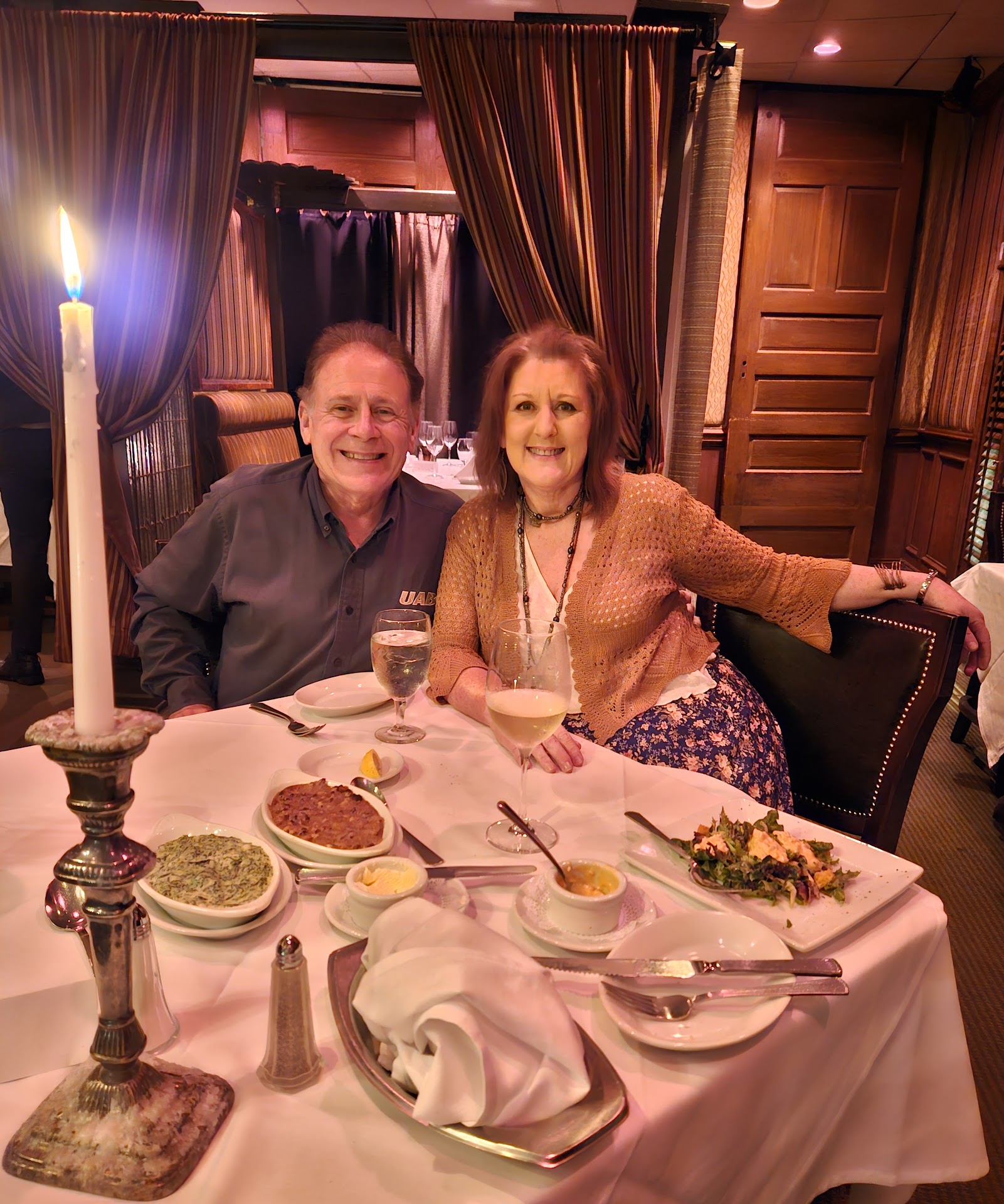 This was the first time we have dined at a Ruth Chris Steak House. The building is not impressive from the outside. We were greeted & had the door opened for us by a a very nice young lady & once inside were treated as though we were royality by each staff member who served us. We had a total of 5 people, plus the manager, making sure we had everything we wanted & that we were happy with the food. Our waitress was so professional yet so warm & friendly at the same time. Kudos to Ruth Chris for their choice of employees. Once inside we were very impressed with both the decor & the atmosphere of the restaurant. It was very comfortable & relaxing, a perfect setting for enjoying a fine meal. The food was delicious & the presentation was exceptional ! Although the prices were "$$$" there are choices on the menu for a " three course meal" which fall in the $45 to $55 price category. My husband enjoyed the filet & especially the appetizer "ahi tuna", both superbly prepared, grilled asparagus & the fresh tomato salad with balsamic demi-glaze & chopped mozzrela. I did not chose an "entree", instead I ordered from the appetizer , soup, salad & sides selections. My choices were the french onion soup, the chopped salad (now among my favorites) , the sizzling shrimp (my all time favorite, it is addictive) the seafood tower (lobster, blue crab, King crab and shrimp), scalloped potatoes, & white chocolate banana cream pie. I'm from the New Orleans area, that being said, the crusty but very light warm bread loaf they serve is the best bread I have ever eaten. My husband had a beer & the Ruth Chris martini (again addictive). The martini had vodka, a liquor (can't remember which one) & spices such as rosemary that one would not expect in a cocktail. I had never tasted a martini before, now I understand why people enjoy them. It was a very unusual taste for me, but one I enjoyed. My only suggestion, like/dislike, would be my personal preference, of serving the seafood tower not as cold. I would have preferred it warmer. It seemed the cold kept the flavors from being fully enjoyed. Our bill without tip was $237.00. Expensive, yes, by our standards, however we plan on returning once every 6 months & on special occasions. A memorial dinning experience in every way. Thanks "Ruth Chis Steak House of Mobile, Al." for a delightful and thouroghly enjoyable evening & the most delicious food I ever tasted! ...